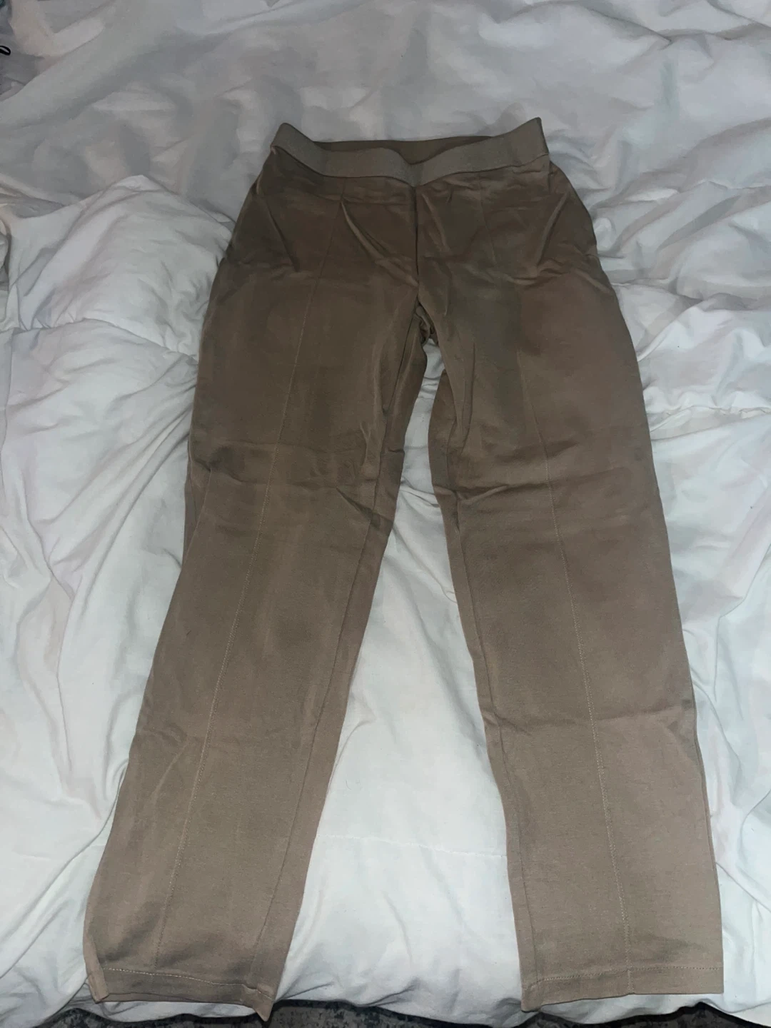These UNIQLO lounge pants are a size small. They're made from a blend of rayon, nylon, polyester, and spandex. The waist measures 60-66cm.