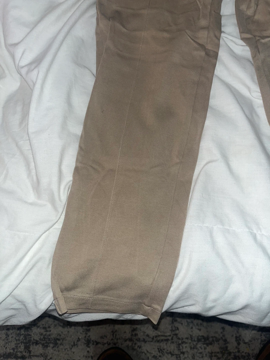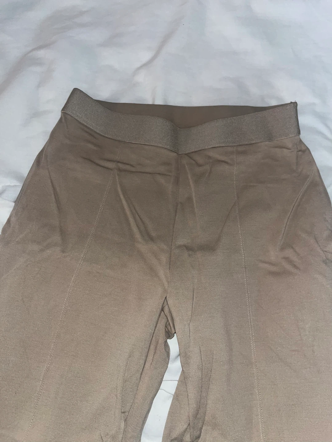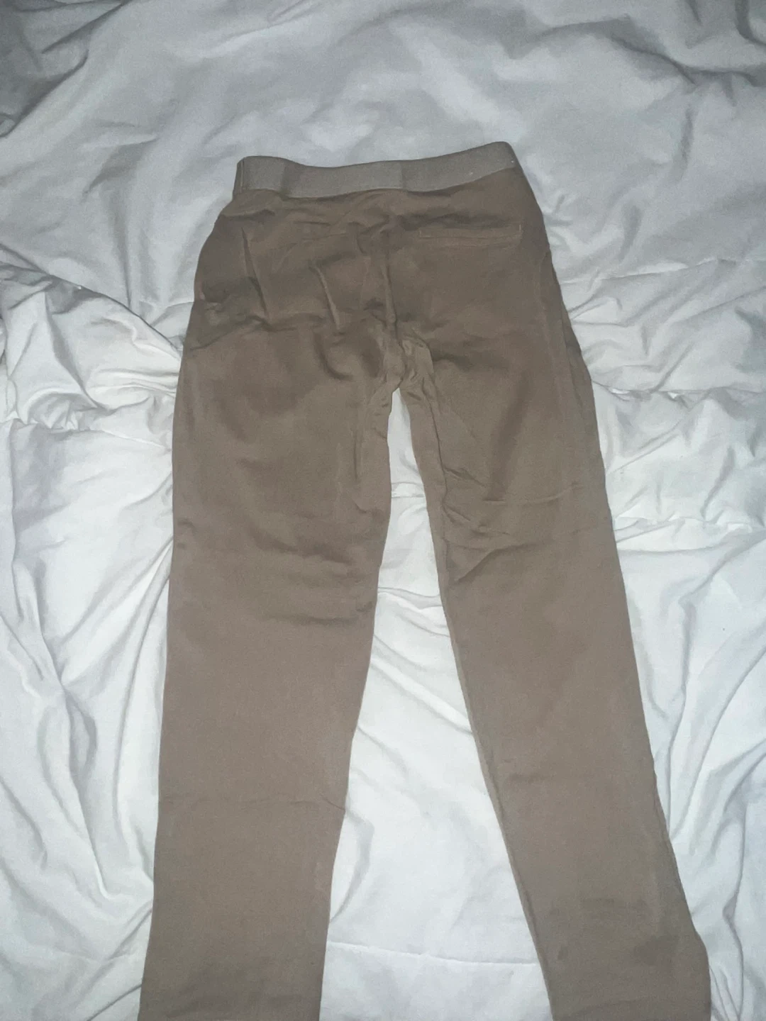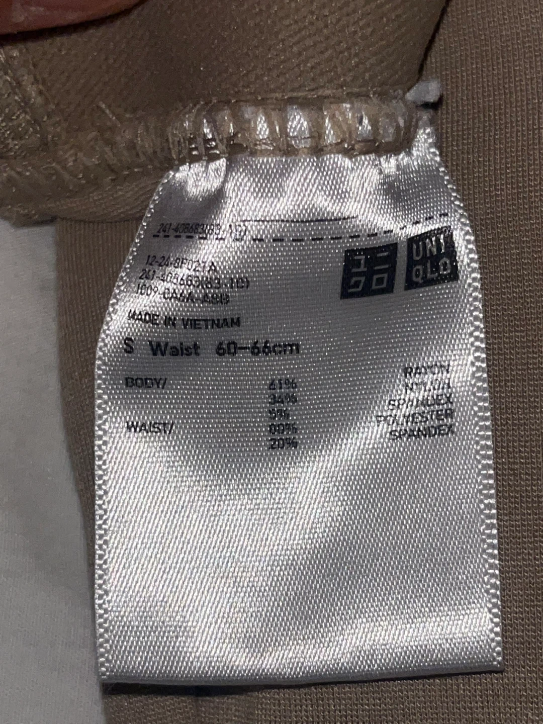 These UNIQLO lounge pants are a size small. They're made from a blend of rayon, nylon, polyester, and spandex. The waist measures 60-66cm.