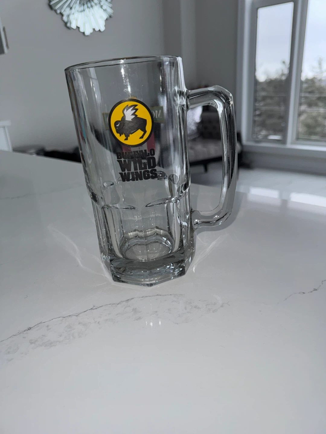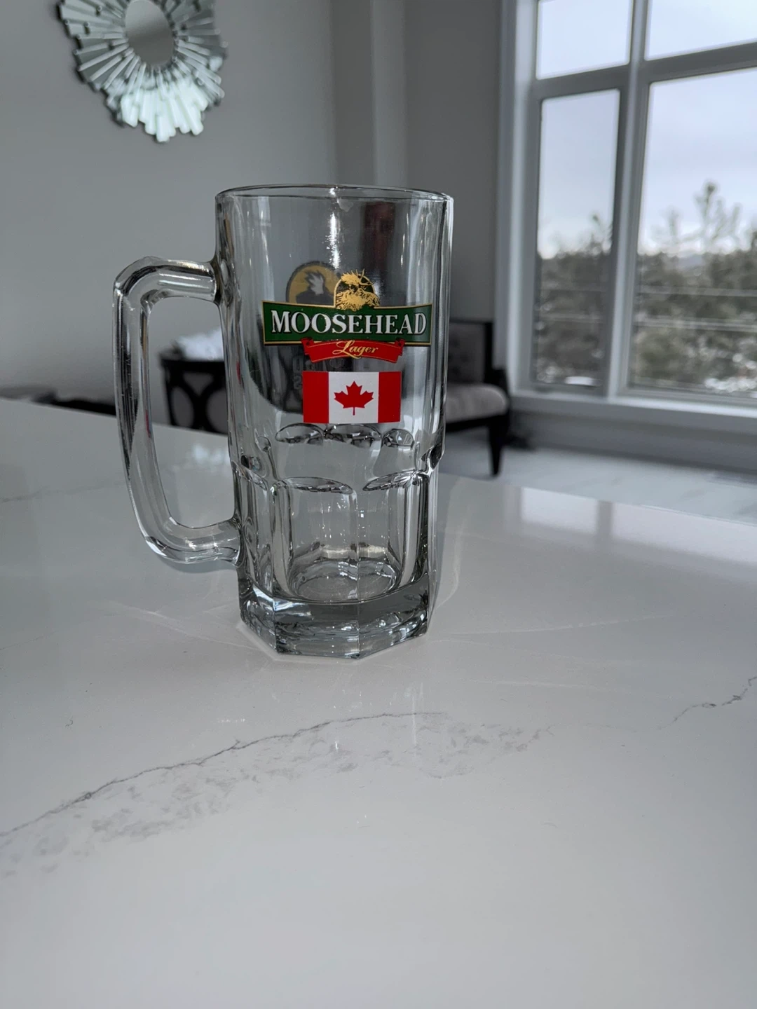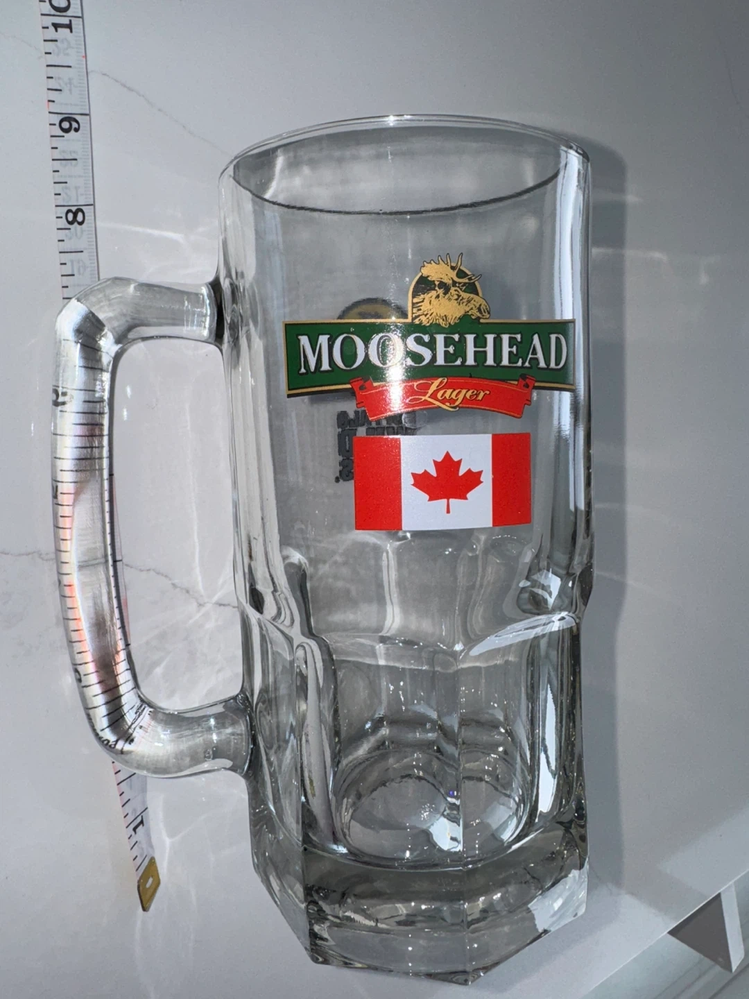 This glass beer mug features logos for Moosehead Lager with a Canadian flag and Buffalo Wild Wings. It has a sturdy handle and a classic dimpled design. Great for enjoying your favourite cold beverage! Length 9inch