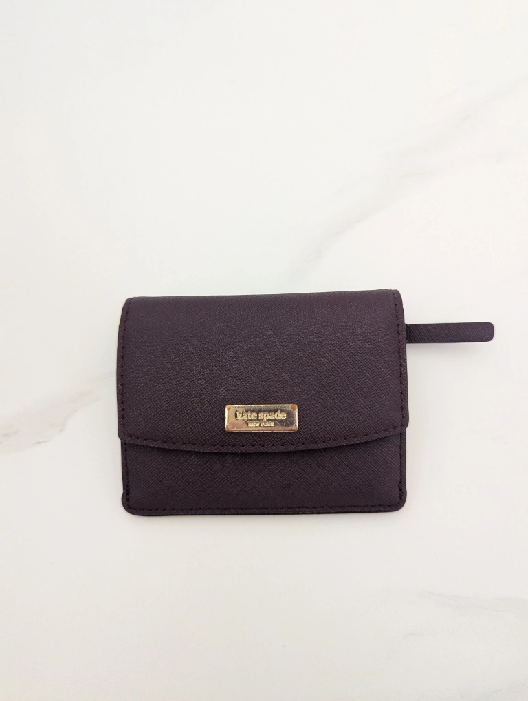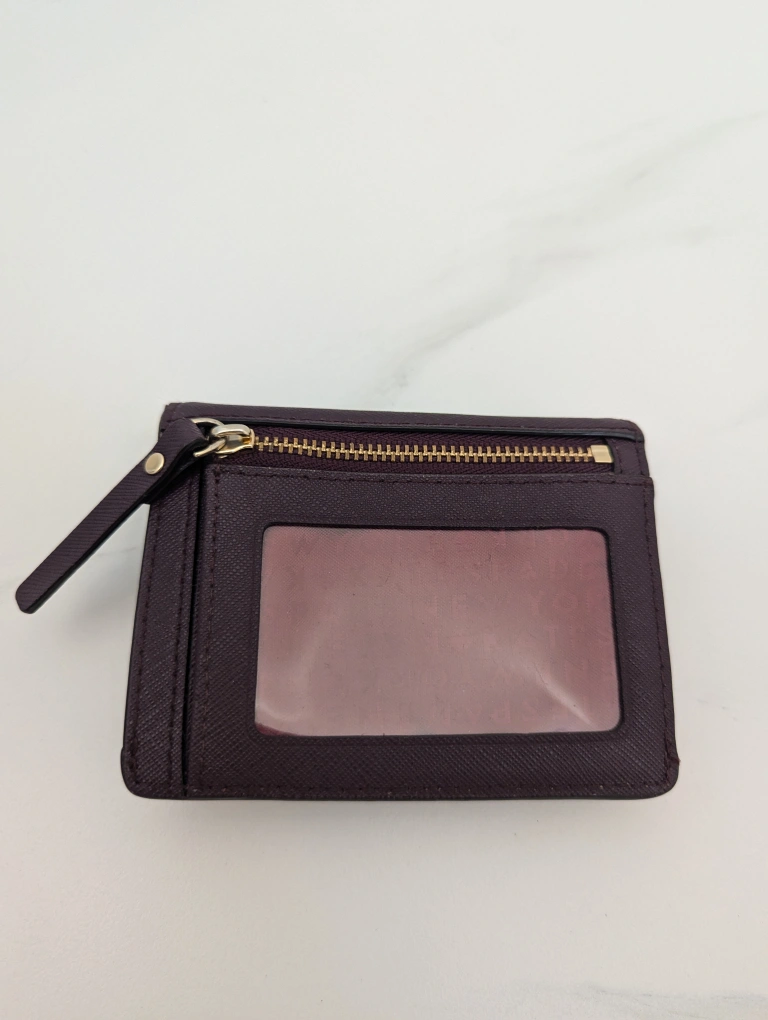 A burgundy Kate Spade card holder with a zipper compartment on the back and multiple card slots inside. There is also a small pocket inside for bills or receipts. please note meeting place at 298 John St Thornhill weekends or Union station weekdays, thank you. cash only
