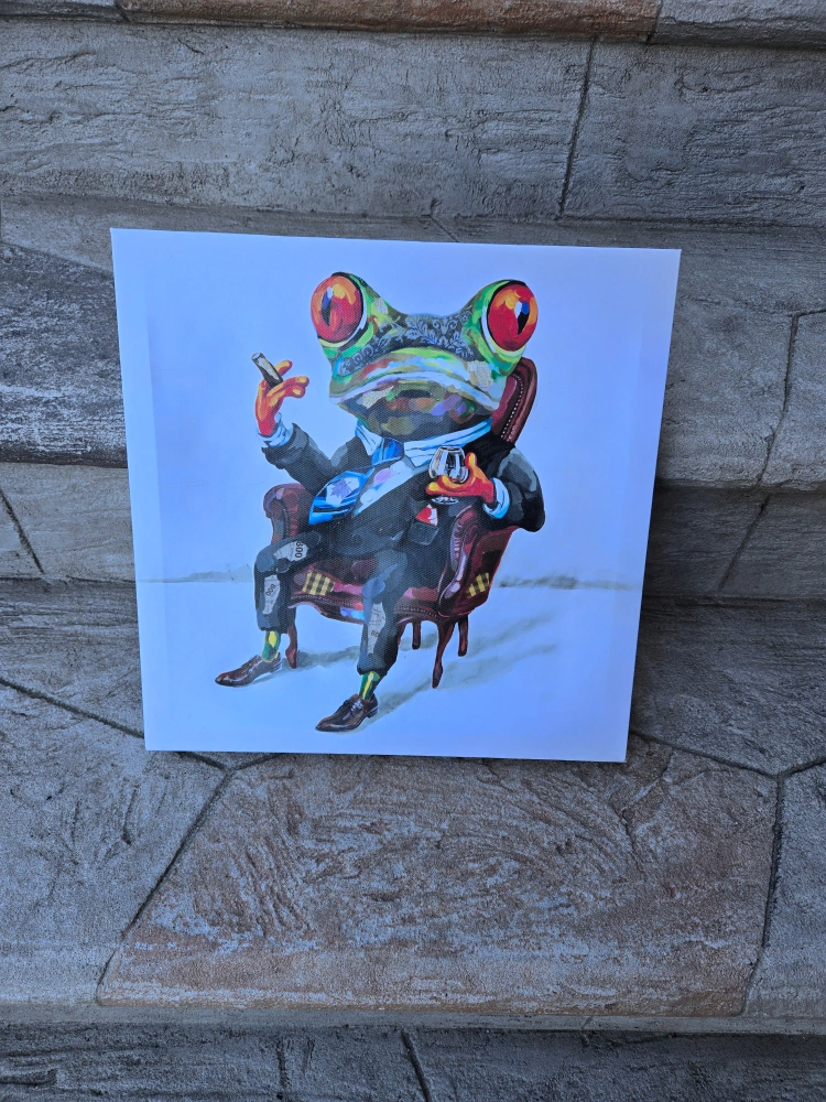 This is a print of a frog sitting in a chair with a cigar and a glass of whiskey. The art is printed on high-quality paper.