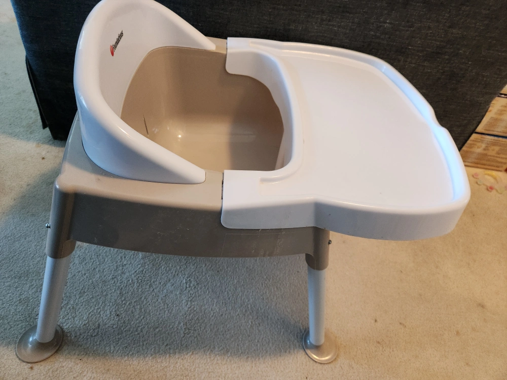 A baby chair with a white tray. It is beige and grey in colour. It is in used condition.