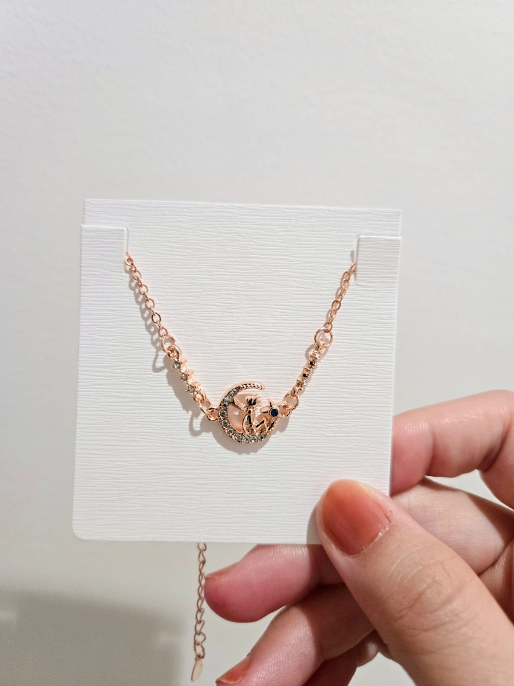 Delicate rose gold necklace with a crescent moon pendant and rhinestones. The pendant features a small star. The chain is adjustable.
