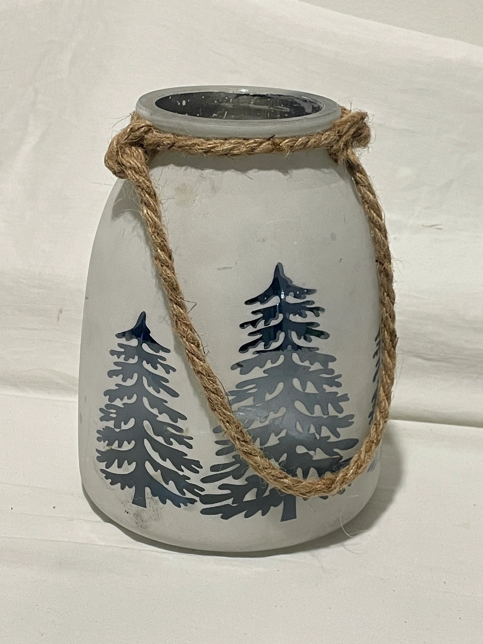 346A glass jar with a rope handle and pine tree design. Would make a nice Christmas decoration or decor for the cabin! Pick up Steveston North