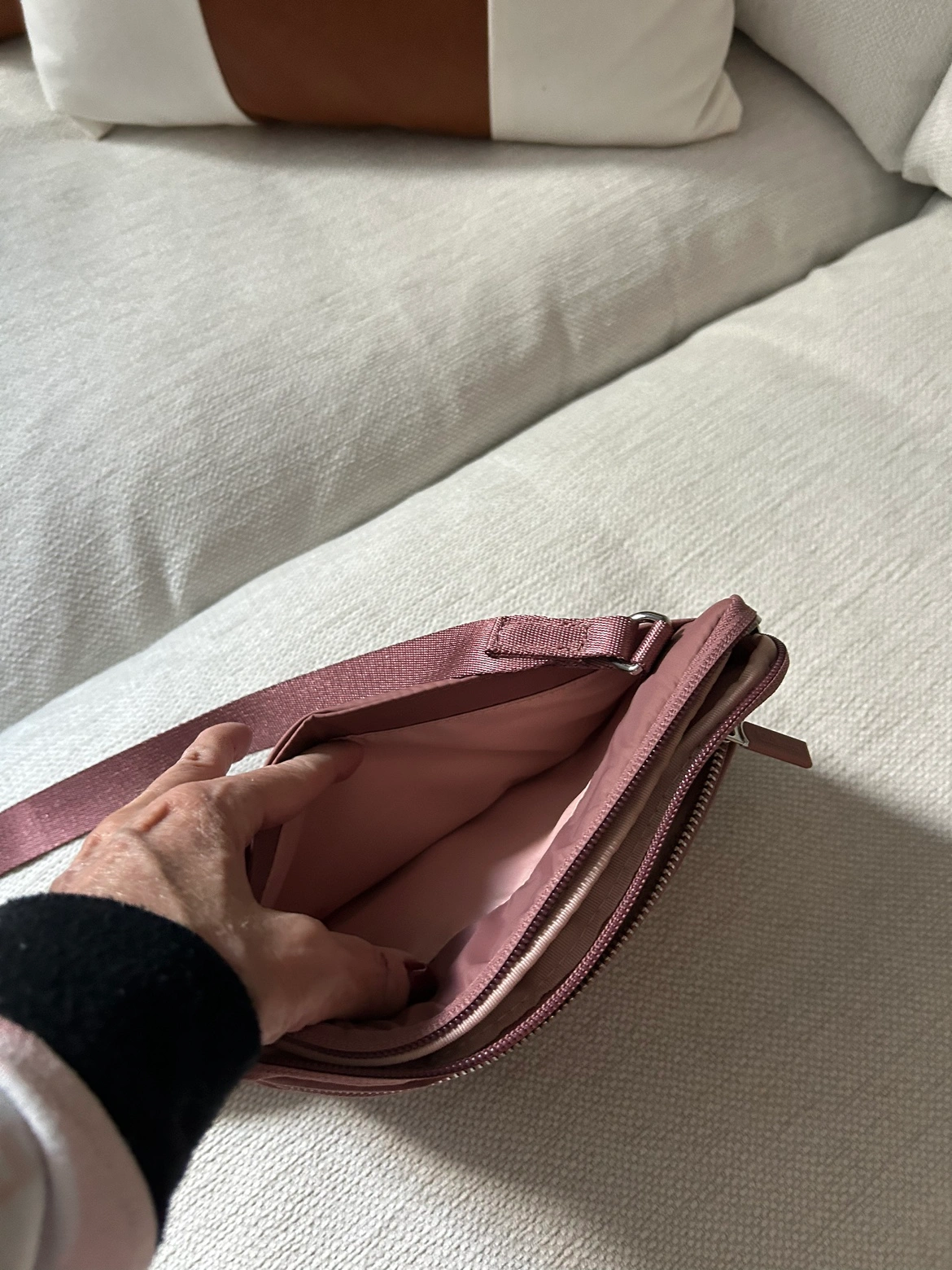 Pink coloured belt bag with a detachable strap. It has a large main compartment with a zippered pocket inside as well as a zippered pocket on the outside of the bag. There is also a small slip pocket on the inside of the bag as well as an elastic mesh pocket for holding small items.