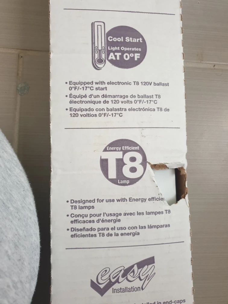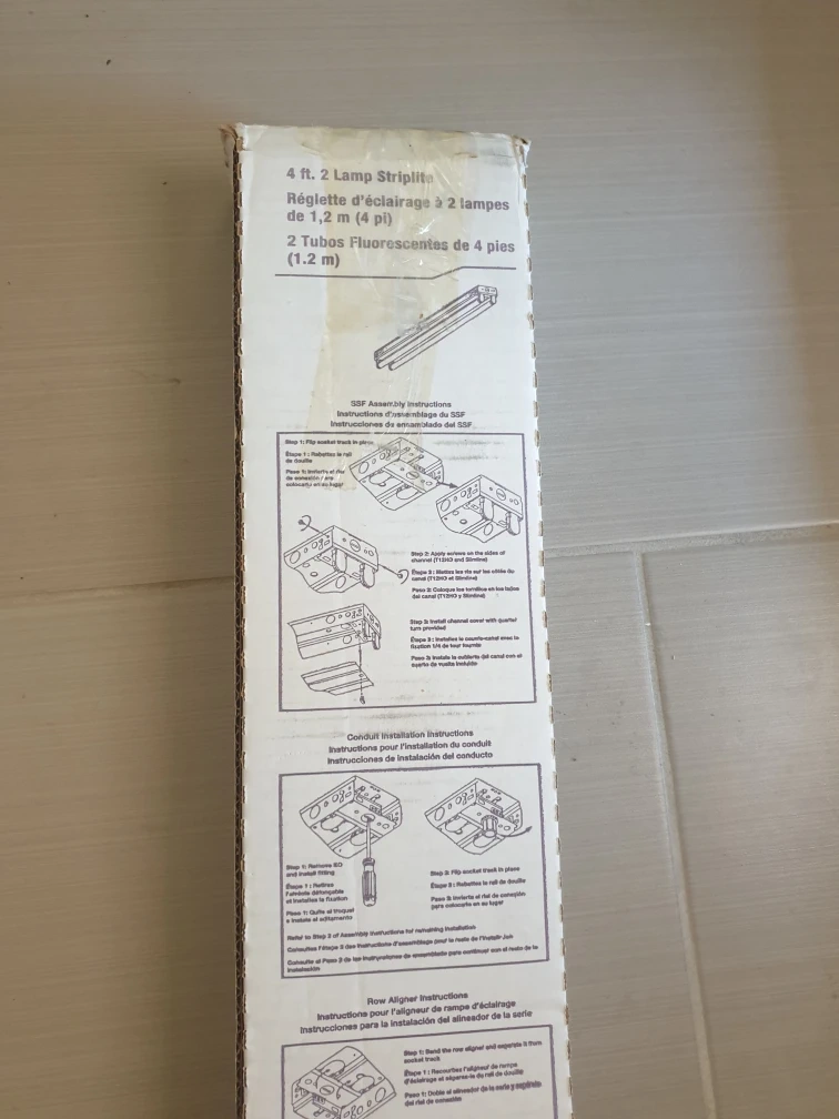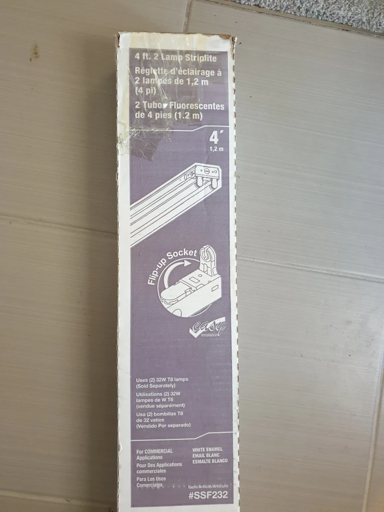 This is a 4 foot long light fixture. It comes with 2 light bulbs. It is a 2 lamp striplite. It is a 120 volt fixture. The fixture uses T8 bulbs and is compatible with energy-efficient T8 bulbs. It has electronic ballasts. It has a cool start feature and operates at zero degrees. The box contains all installation instructions and hardware. The instructions are available in French and English.