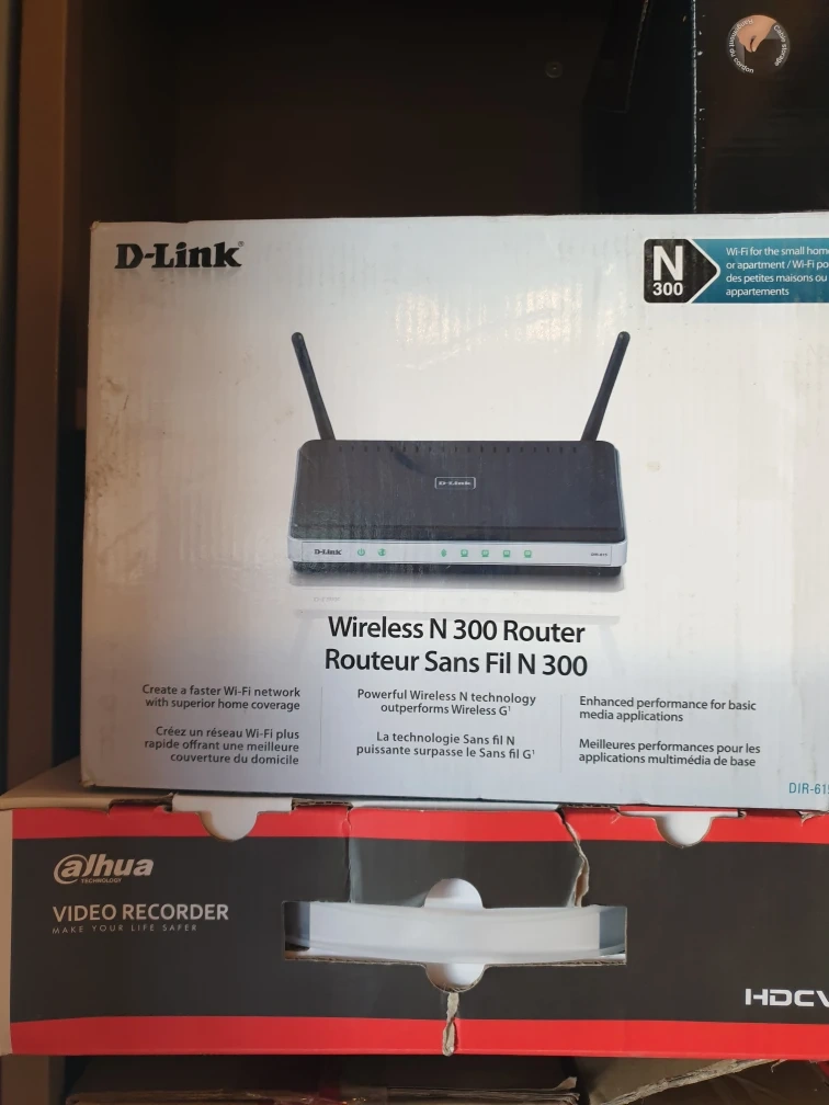 A D-Link Wireless Router N300 model DIR-611. It is black and has a white D-link logo on it. i have also 9 Alhua Cameras with all accessories.