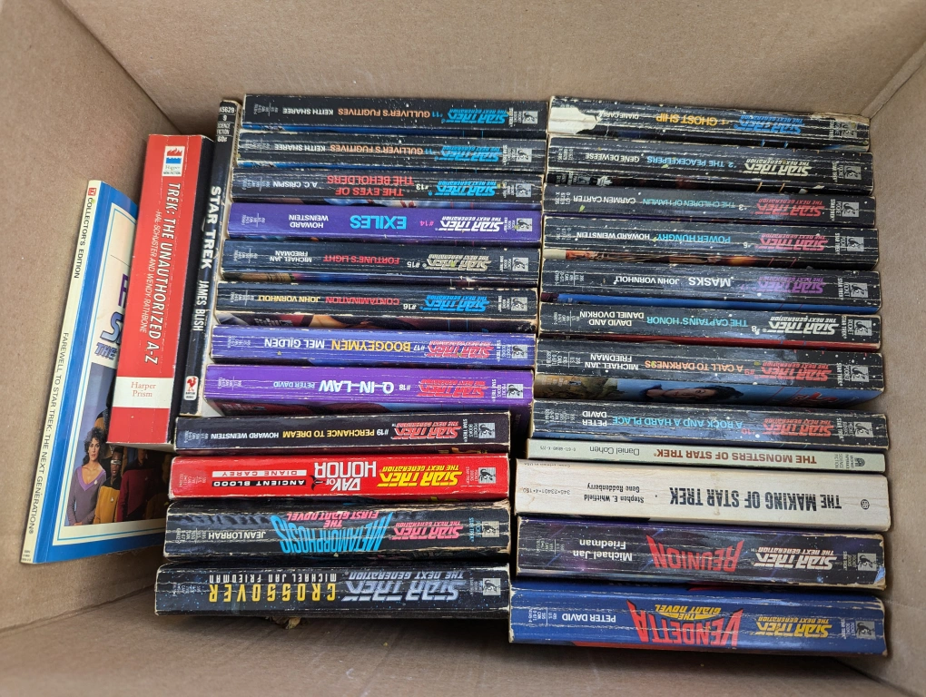A collection of over 50 Star Trek paperback books, considering of mostly novels plus a few additional Star Trek reference books on the side. Mostly Next Generation (because it's the best), but also some Voyager.