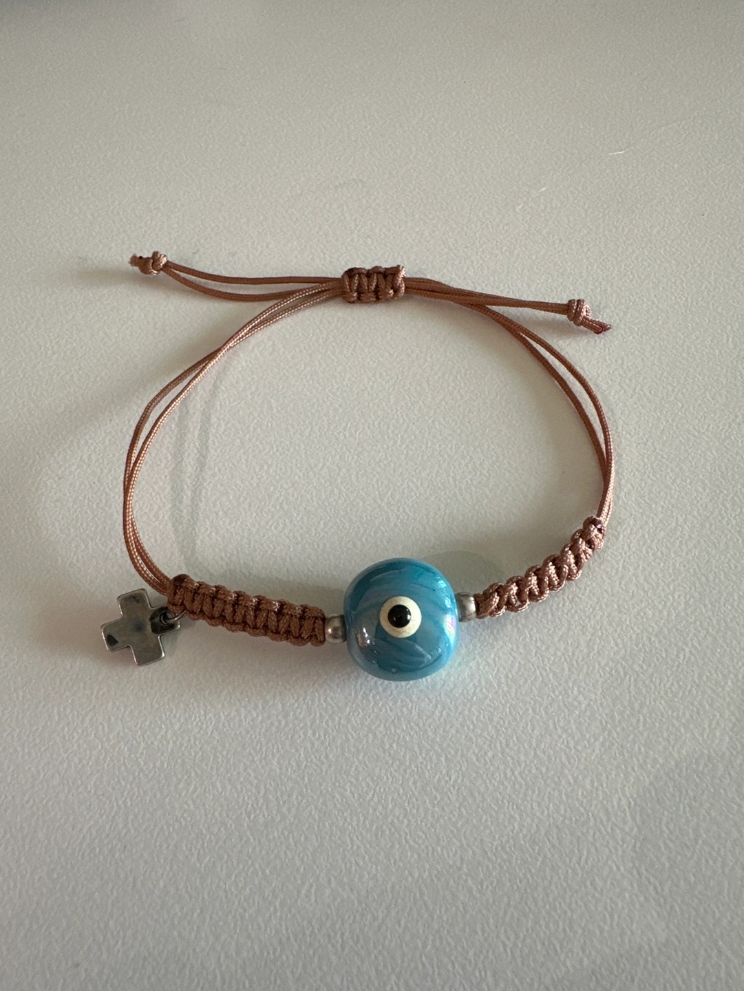 1000+Brown cord bracelet - adjustable Includes an evil eye bead and a silver cross charm.