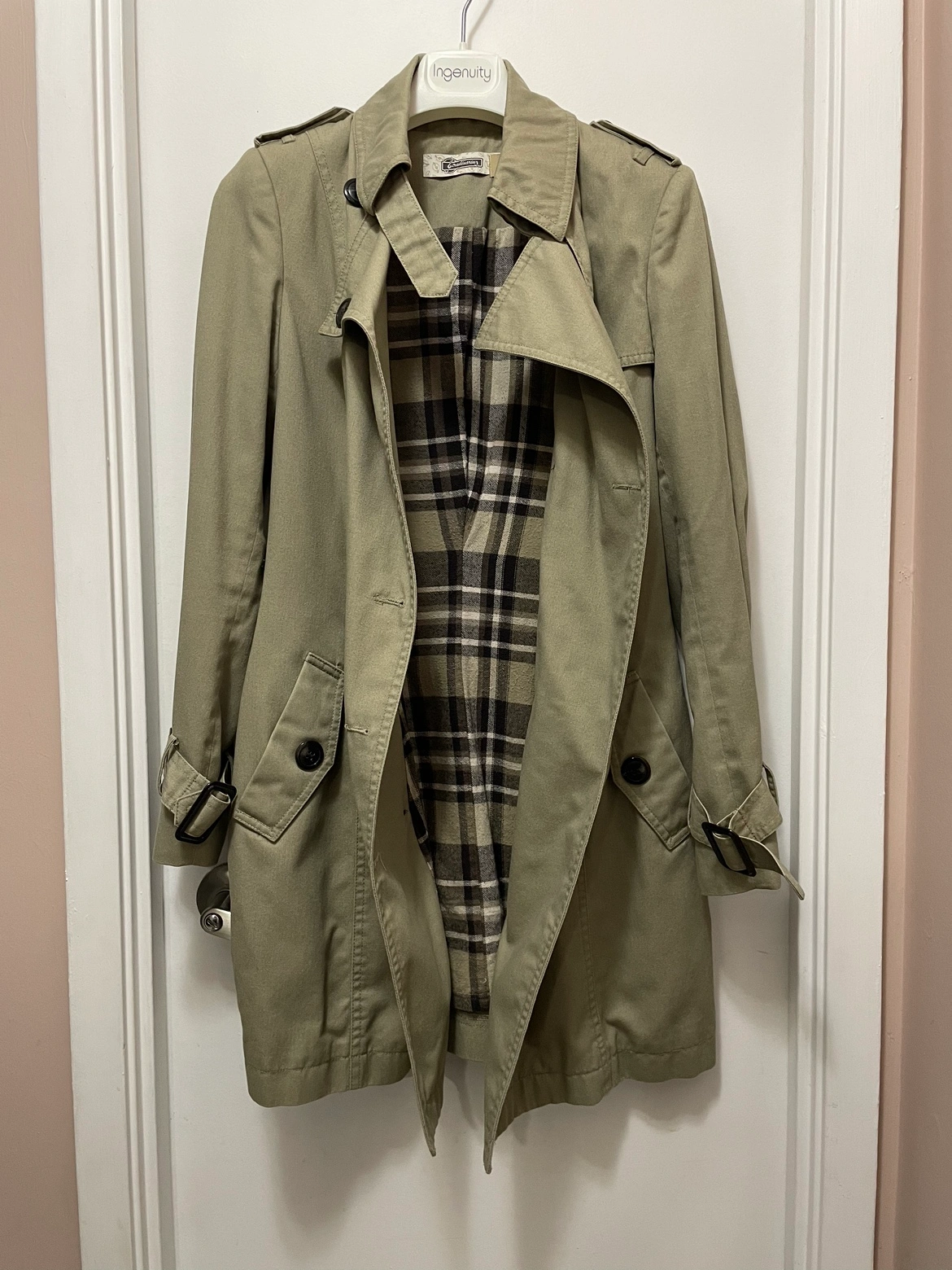 Buy & SellTrench coatTrench coat$10This is a long-sleeved beige/tan trench coat with a plaid lining. It features a double-breasted closure, and pockets. It is labelled as size S.ConditionGoodSizeSmallWHERE TO MEETWynford GardensView MapSELLERverifiedcrisCanterbury Park802 reviews1 chats·0 favorites·34 viewsSEND CHAT TO SELLERHi cris! I’m interested in your listing.Hi cris! I’m interested in your listing.Get the Karrot app to chatSign In to chat