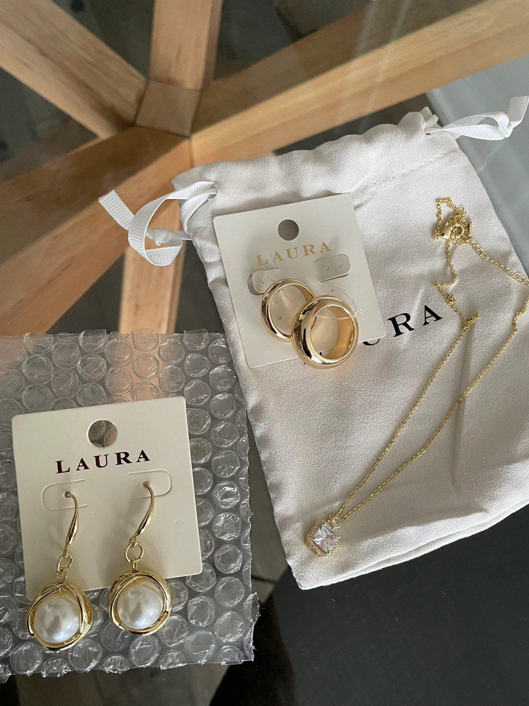 Pearl dangle earrings, thick gold ring set (size 7), and pendant necklace all brand new