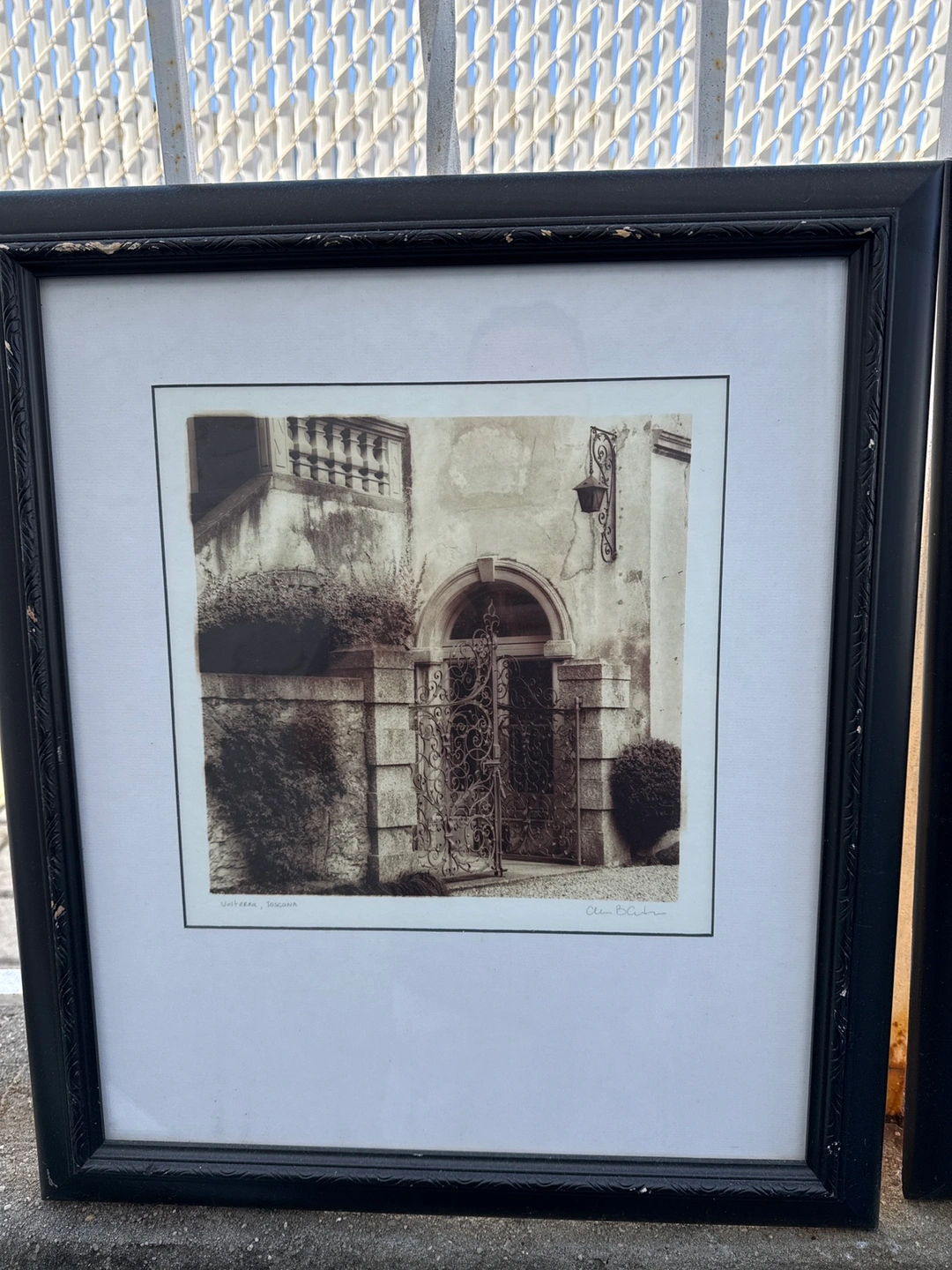 Two framed prints by Olen R. Gibson. Both prints are in black and white. Each print is approximately 12" x 12" and framed in black. The prints are in excellent condition. The prints are signed by the artist. The prints are titled "Garden - Savannah" and "Charleston Garden" respectively.