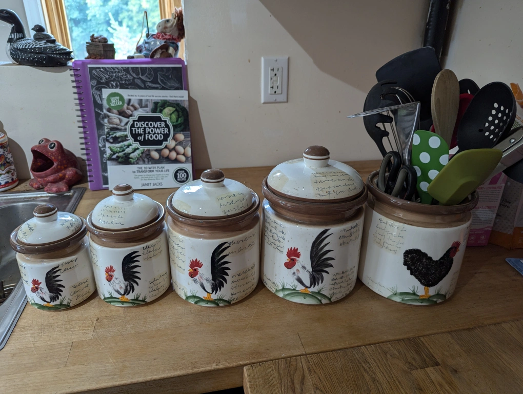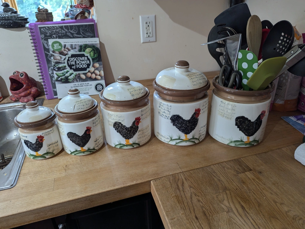 These canisters are in good used condition. They are a great addition to any kitchen and come with lids.