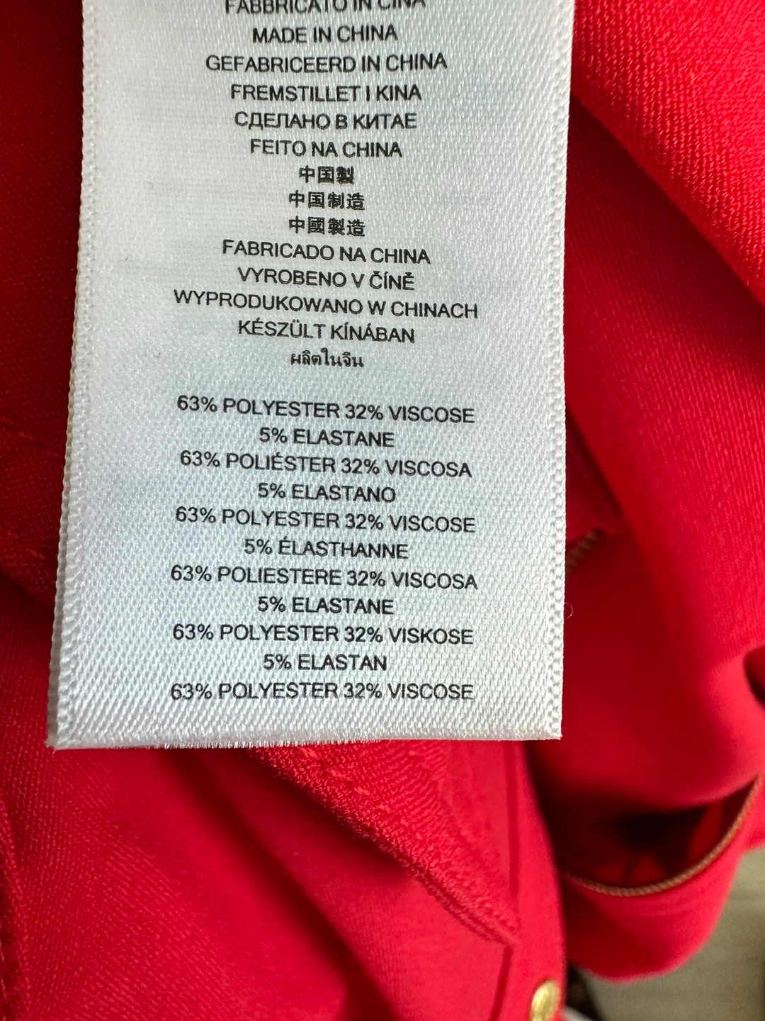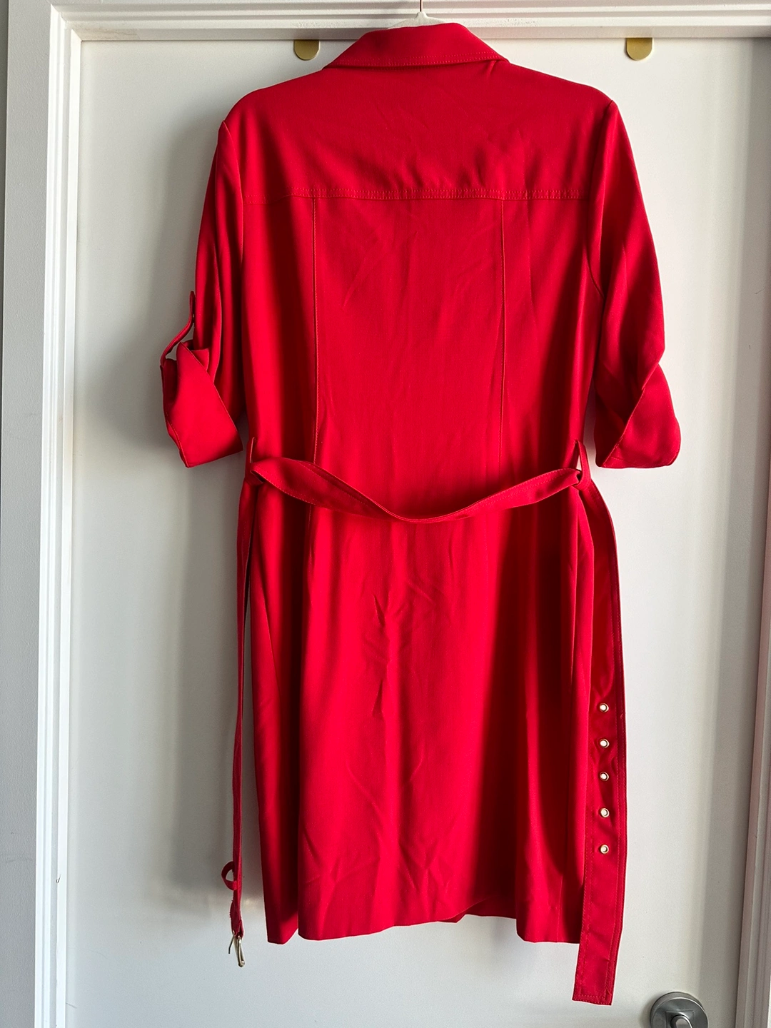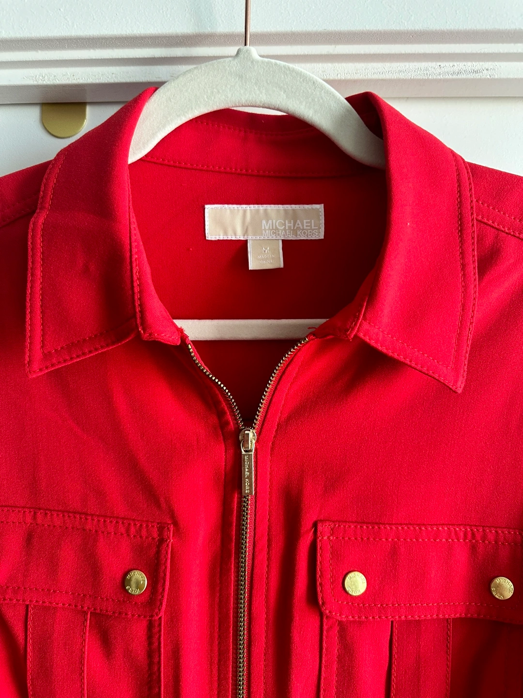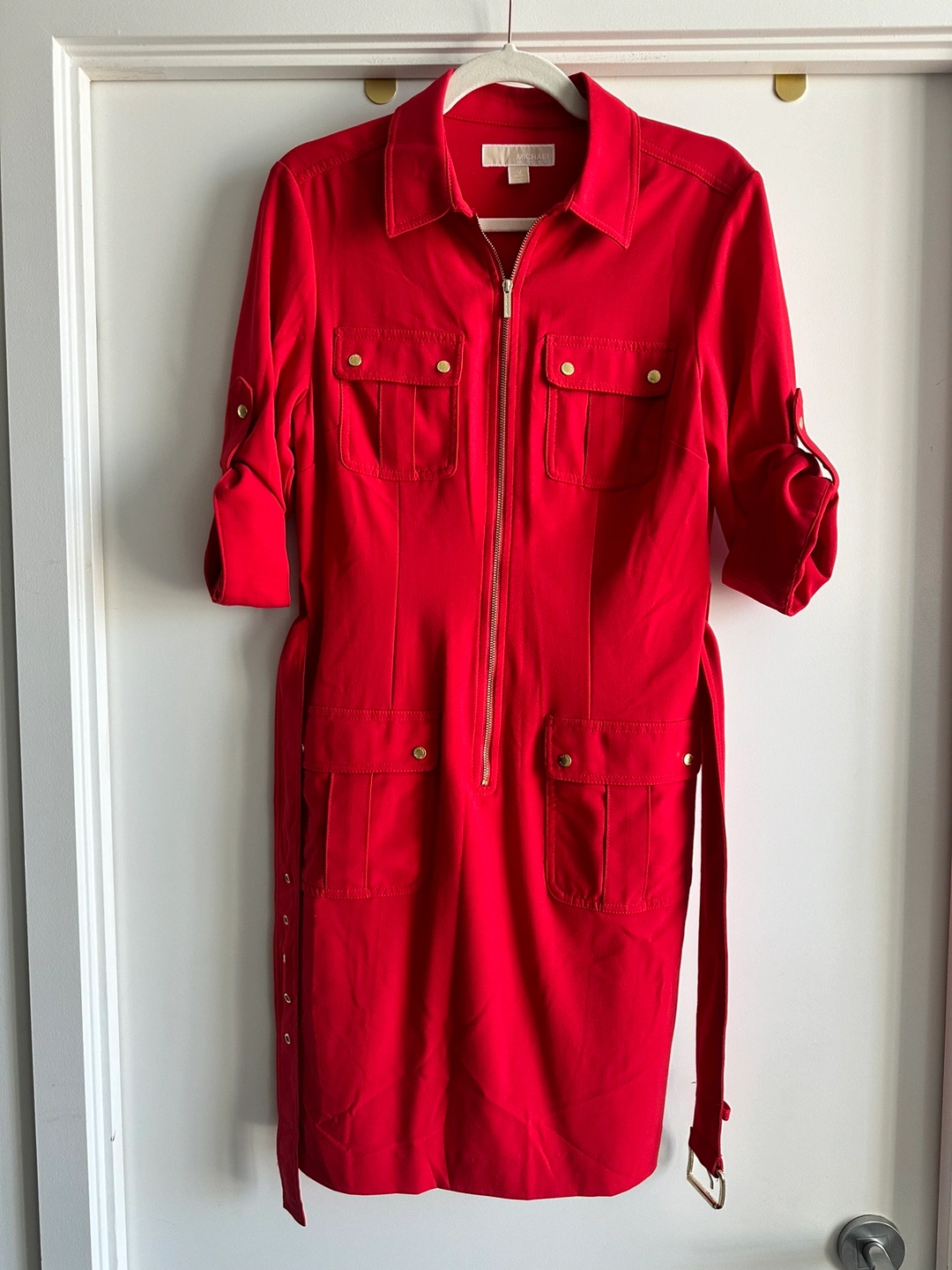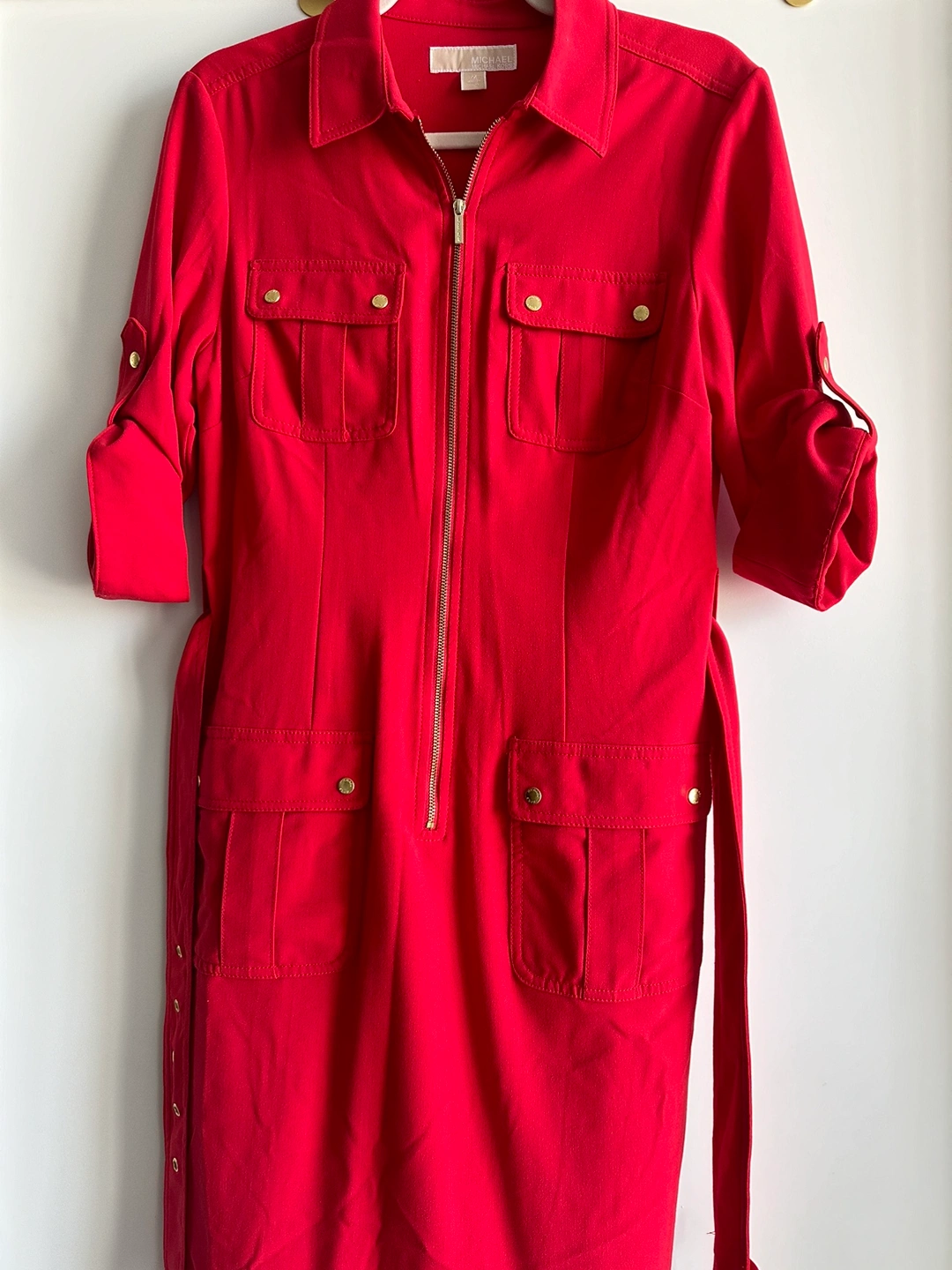584Excellent condition. Michael Kors red, belted dress with gold buttons. Features a front zip, pockets, and a belt.