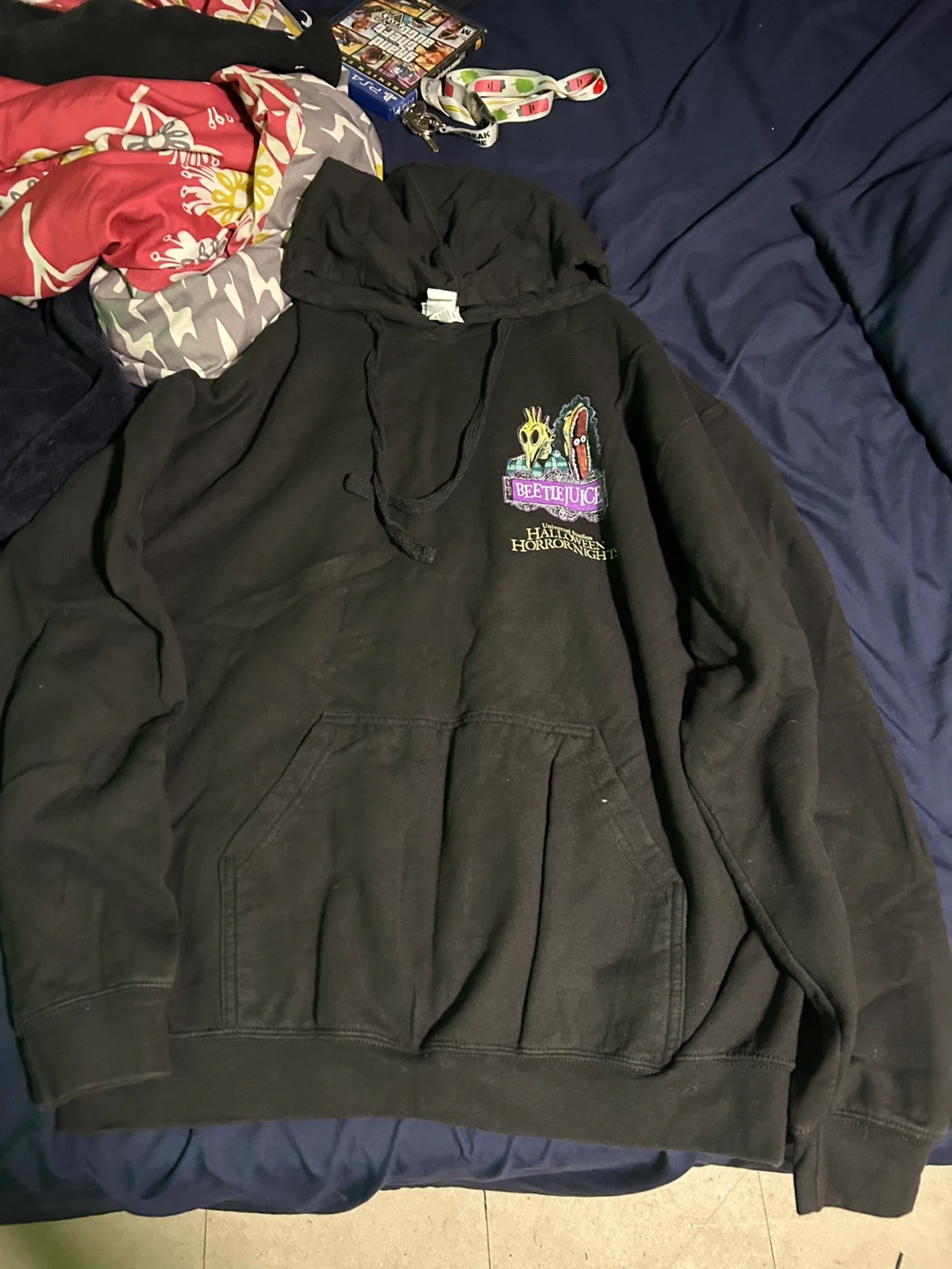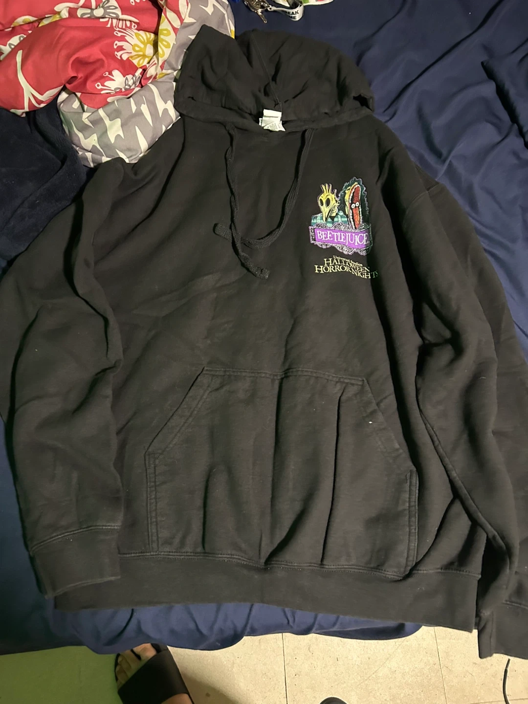 This black hoodie features a large Beetlejuice graphic on the back and the Halloween Horror Nights logo on the front. It's a comfortable pullover style with a front pocket and drawstring hood. Made from a soft cotton blend.