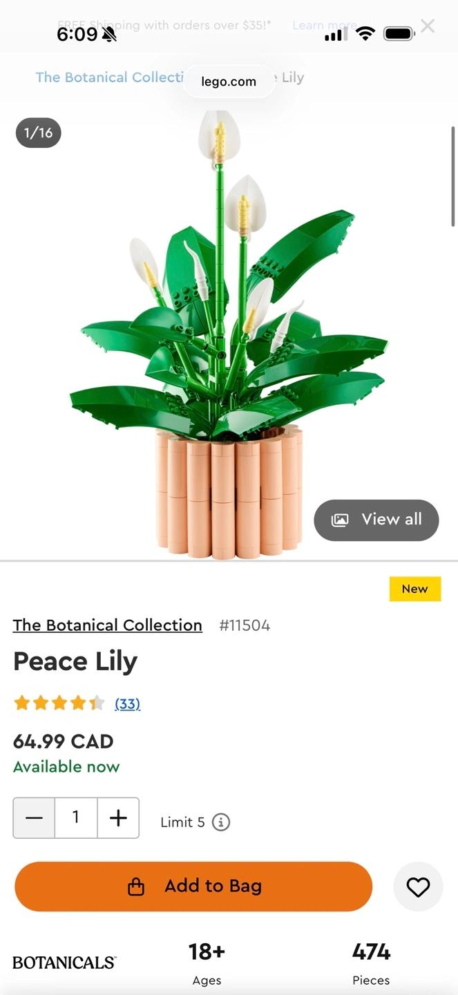 Build your own Peace Lily with this LEGO Botanical Collection set. It includes 474 pieces for a fun building experience. The finished model measures 25 cm (9.8 in.) tall. It's perfect for display!