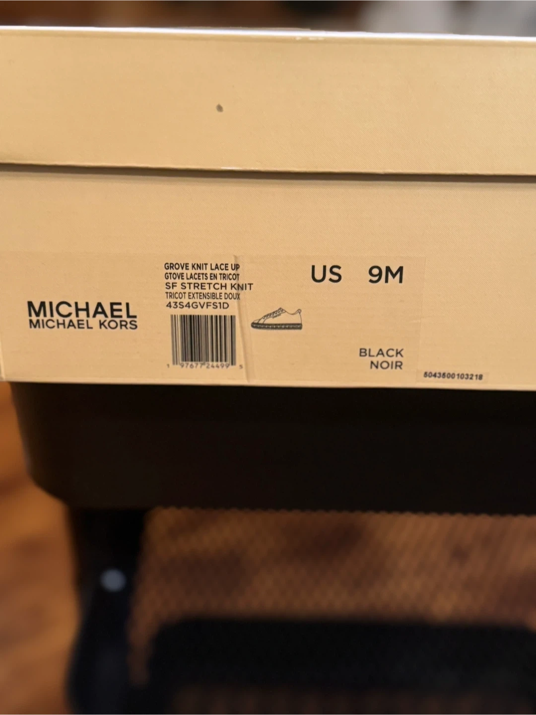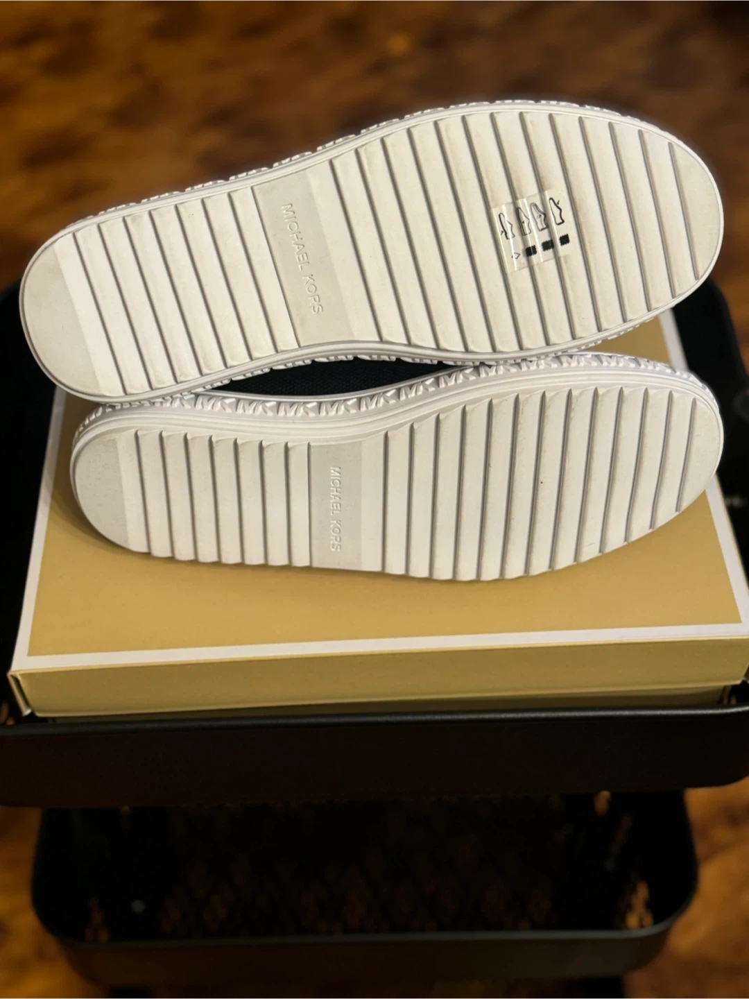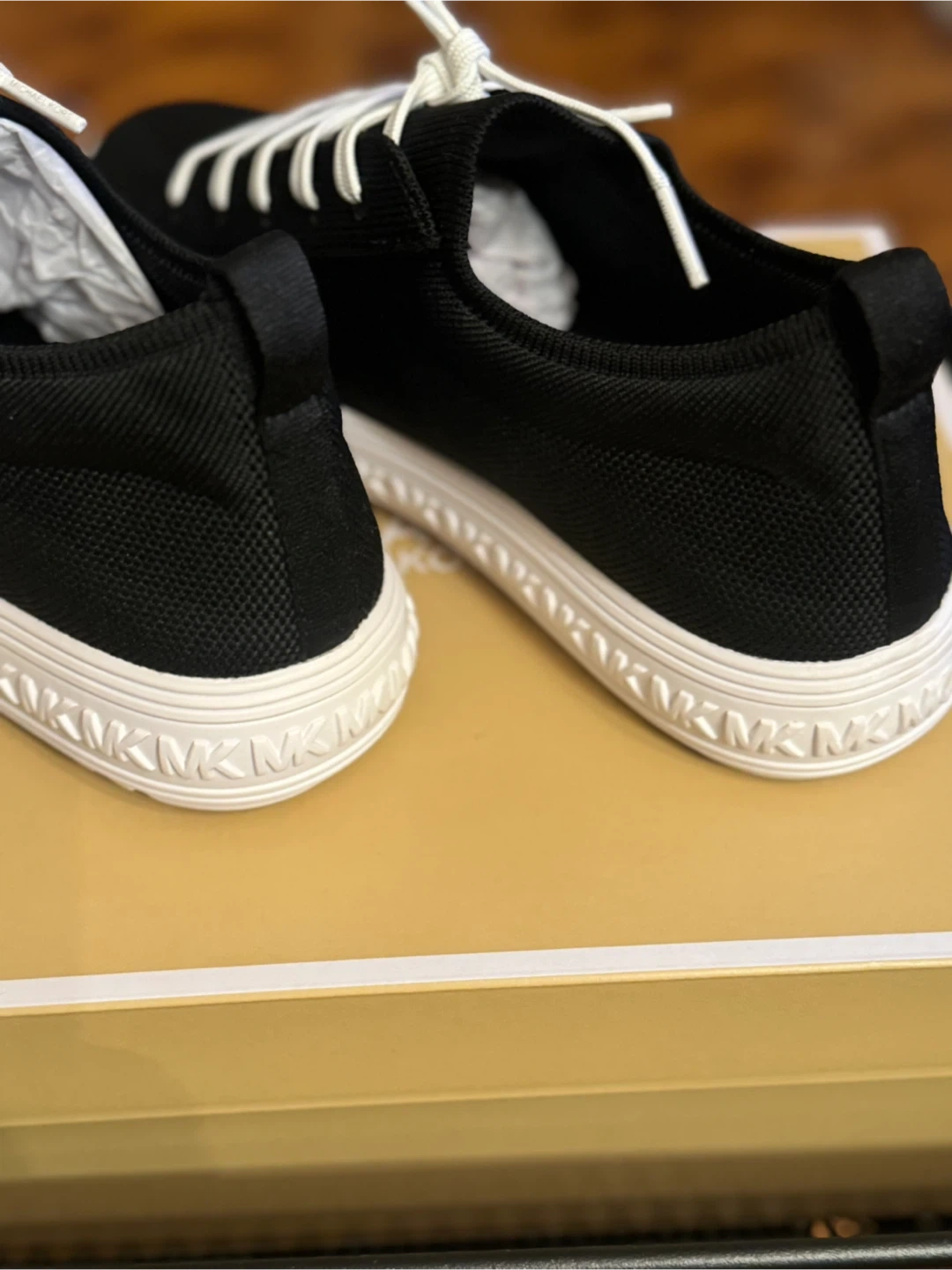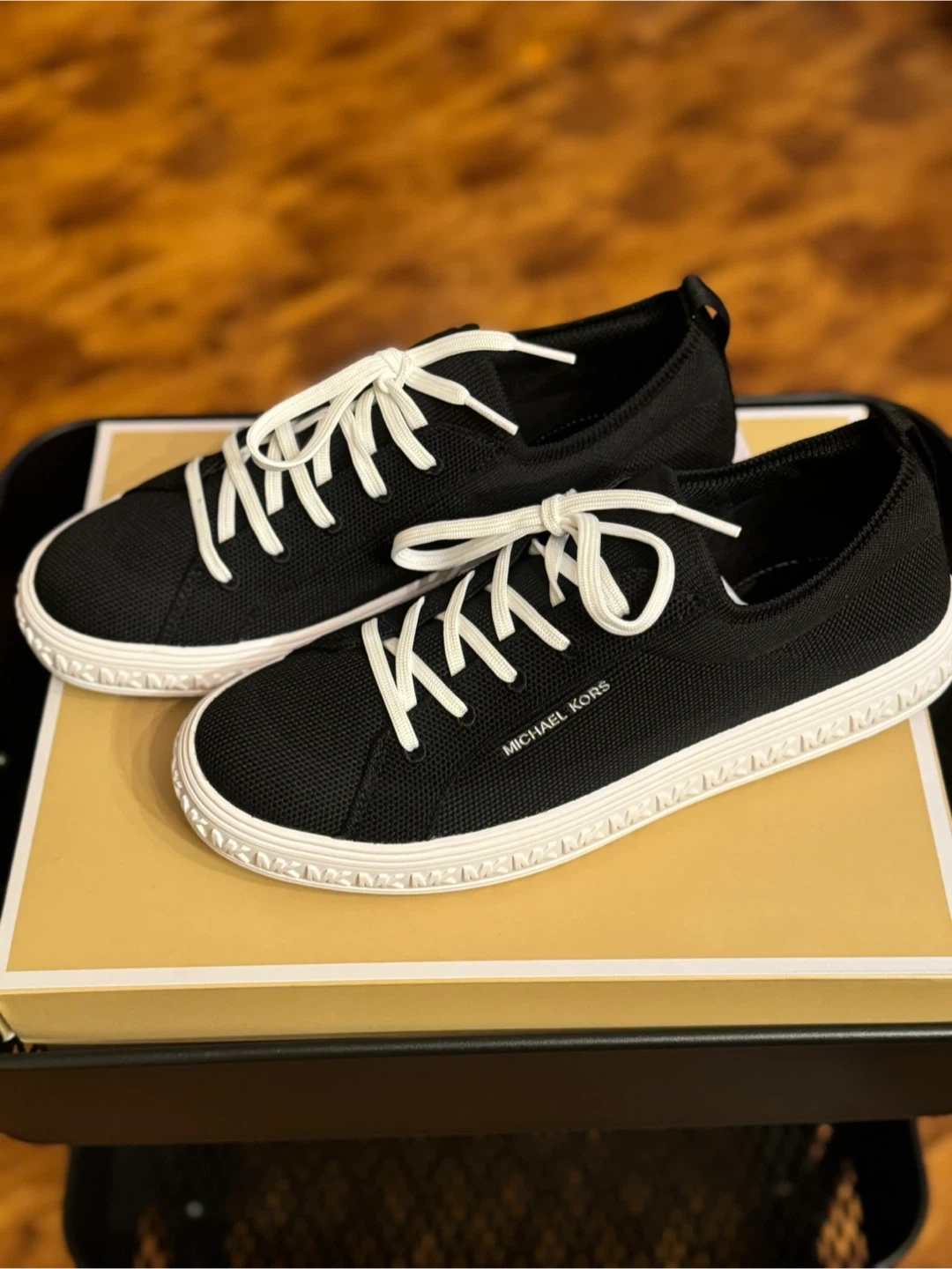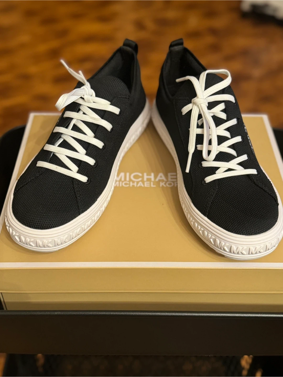 These Michael Kors sneakers are black with white laces and soles. They're made of a breathable textile material. The original box is included.