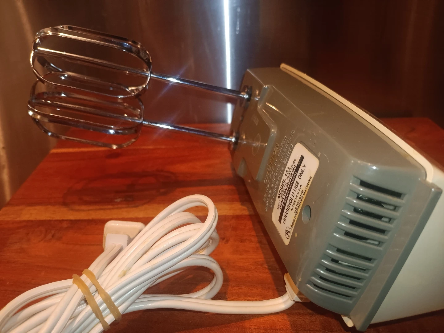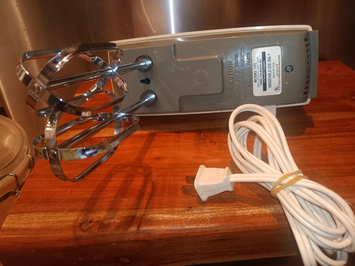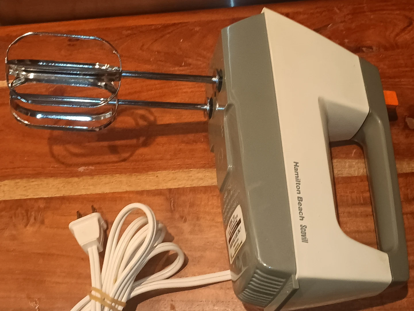 This is a VINTAGE Hamilton Beach Scovill hand mixer, model 151. It's a food preparing machine. It comes with beaters and a cord.