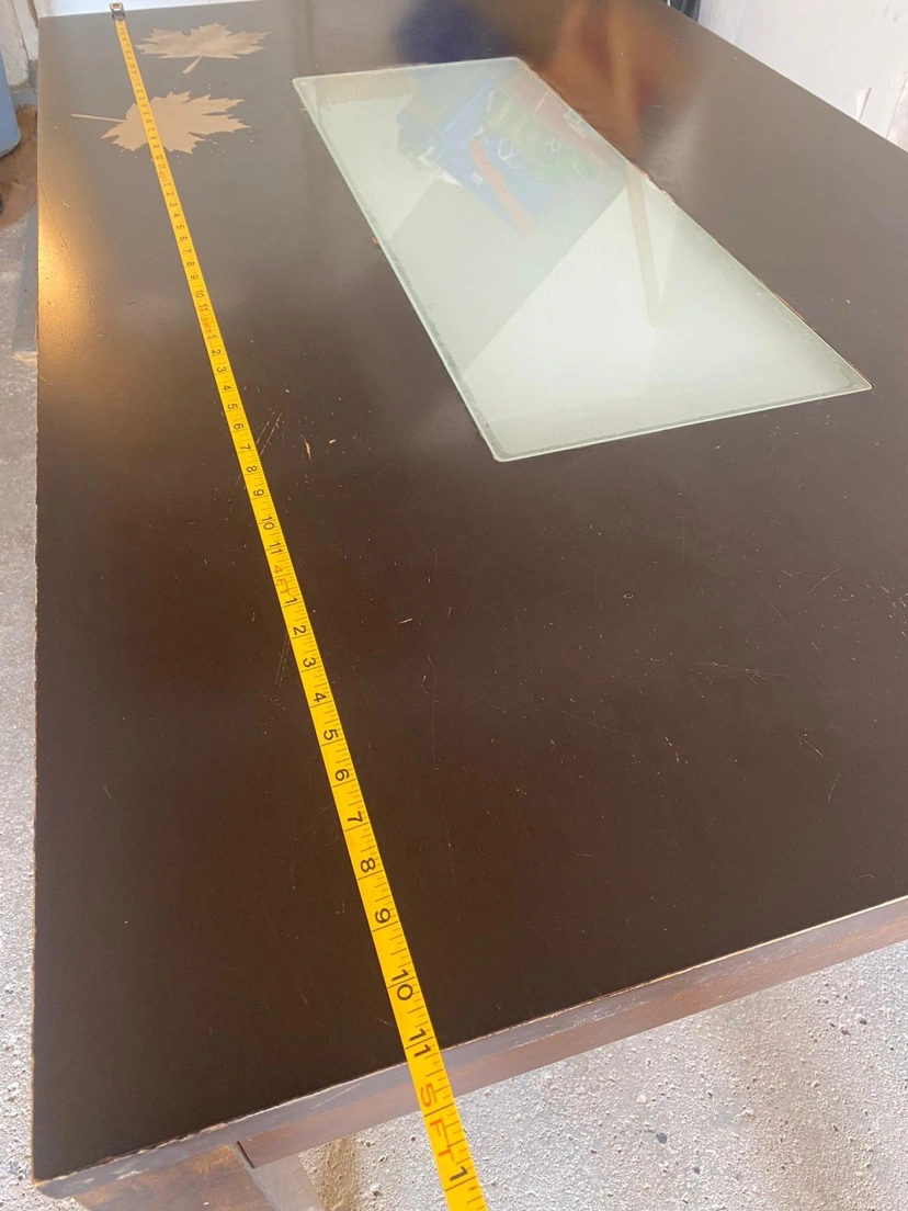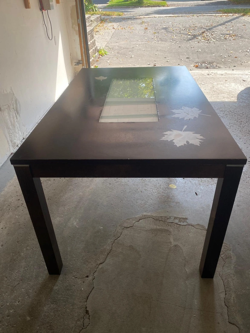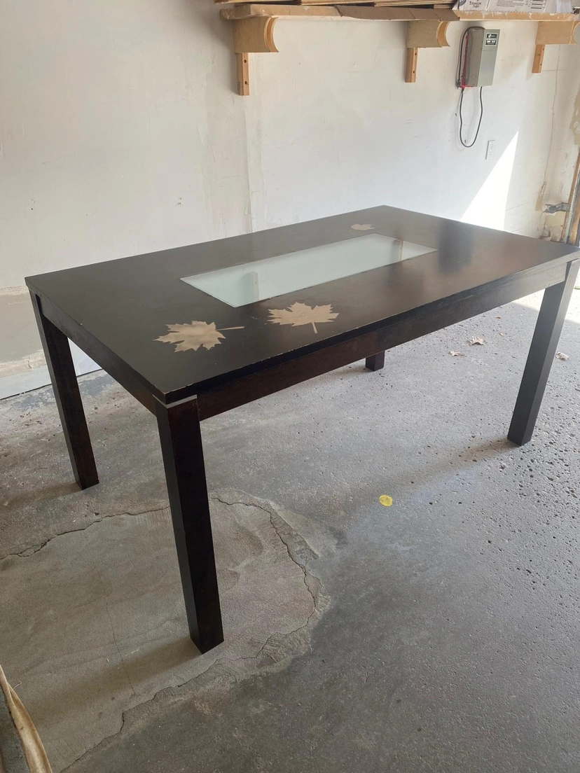 133This table has a glass insert in the middle of the table top and has a maple leaf design etched into the top. Completely solid and good. Some scratches on the top. MAIN INTERSECTION YONGE $16