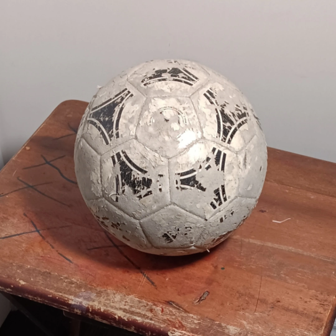 A worn out adidas soccer ball, which is in poor condition due to wear and tear, but it's still a great ball to kick around. It comes with a black and white design.