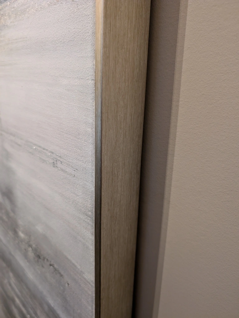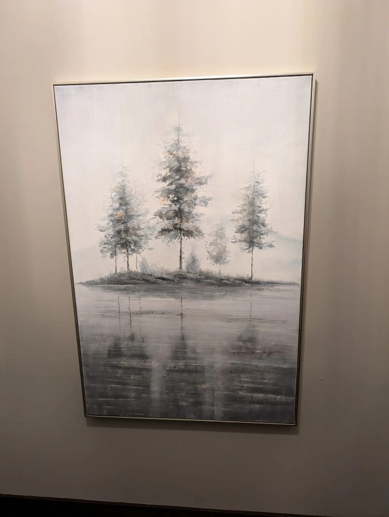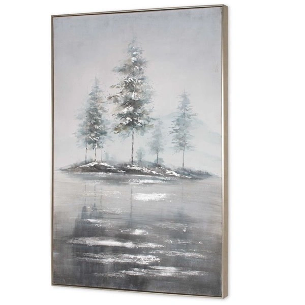 Get lost in the serene calm of these mystic woods. Exquisitely designed and 100% hand painted, this large canvas features a silver floater frame and silver leafing. The neutral calming colour palette makes a perfect addition to any space.