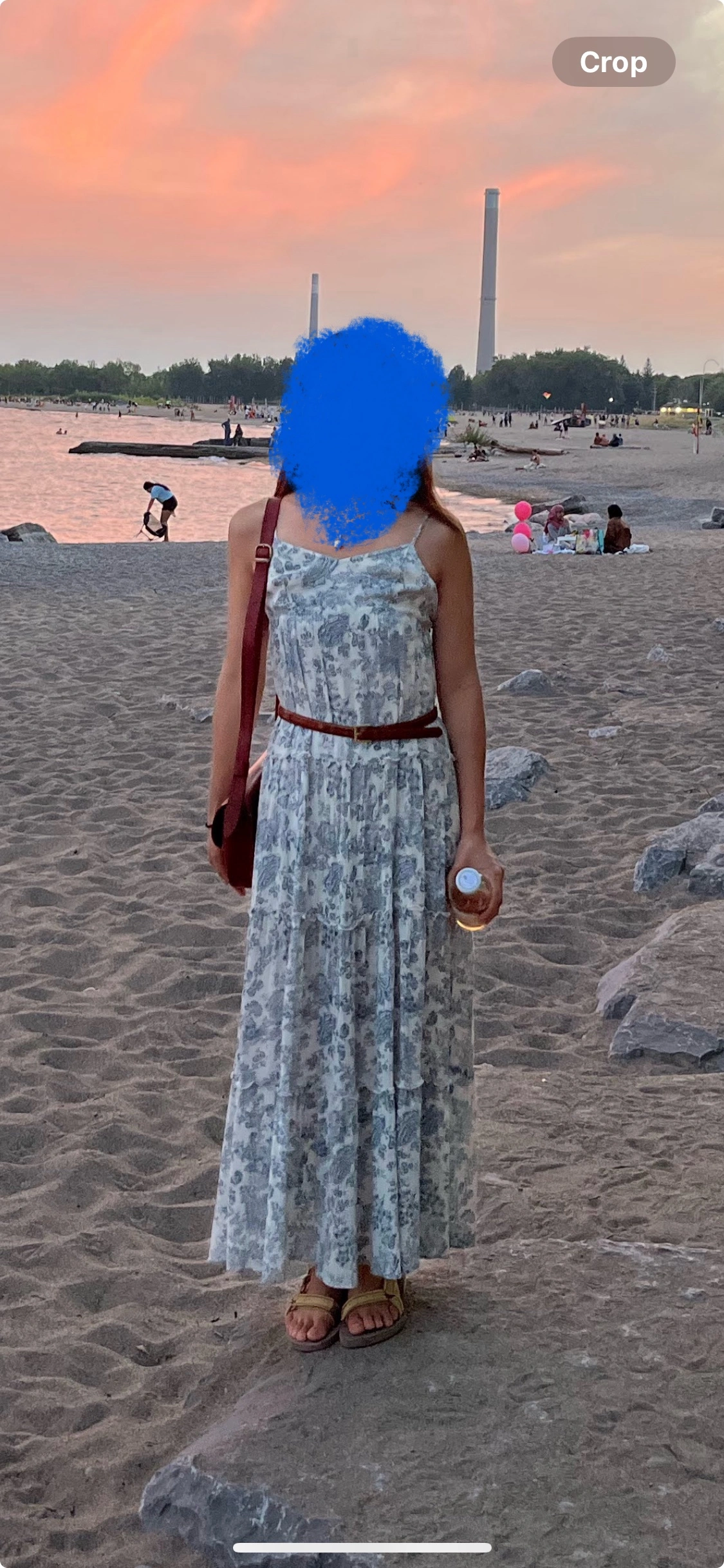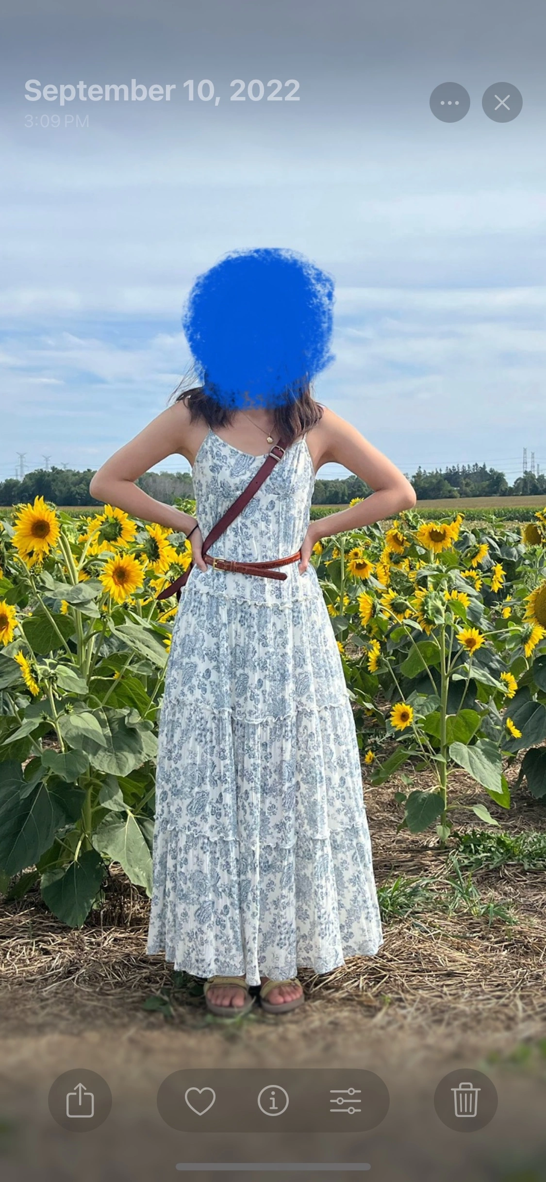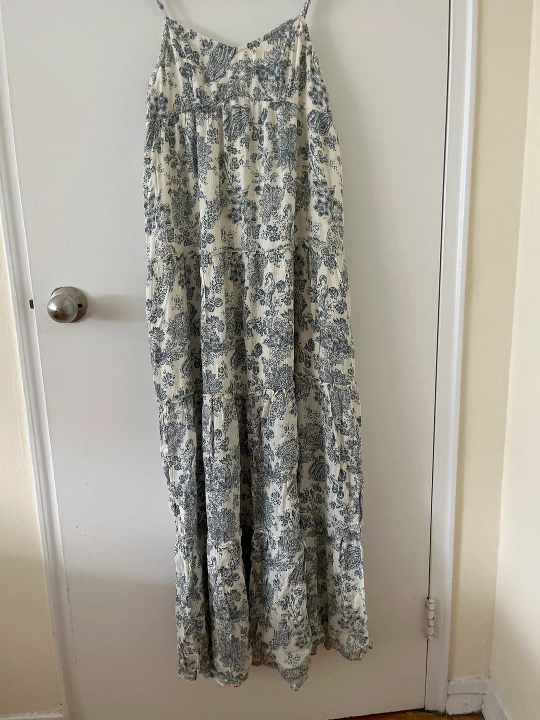 320White maxi dress with a blue floral pattern. Features a fitted bodice and flowy skirt. Has adjustable straps.