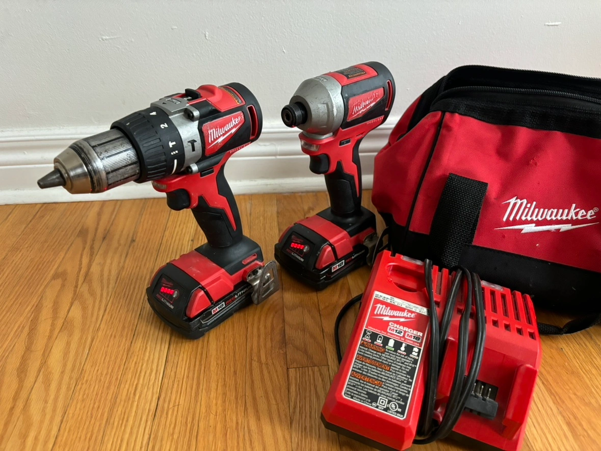 This listing is for a Milwaukee M18 2-Tool Combo Kit. It comes with a drill, impact driver, two batteries, a charger and a contractor bag.