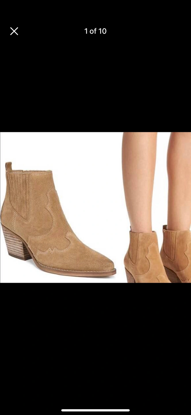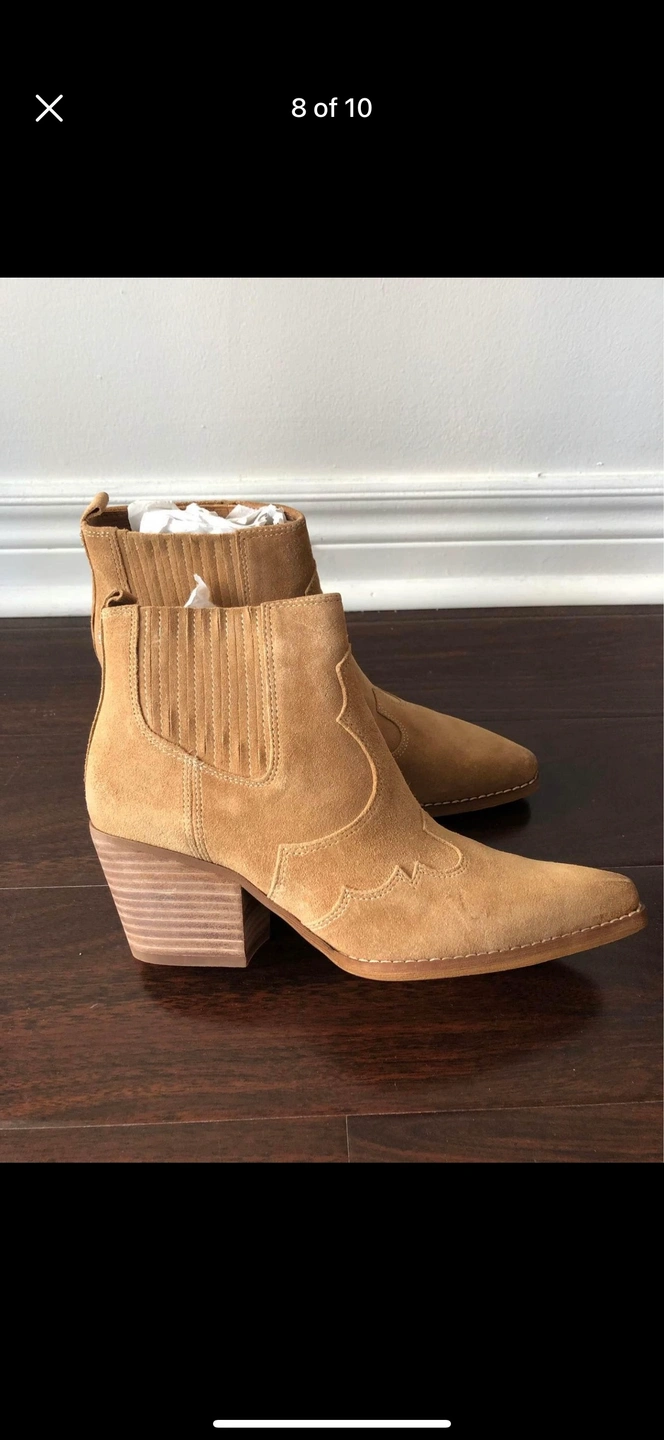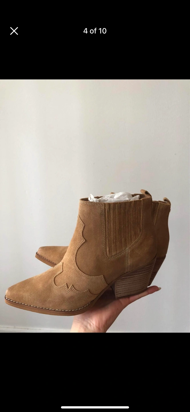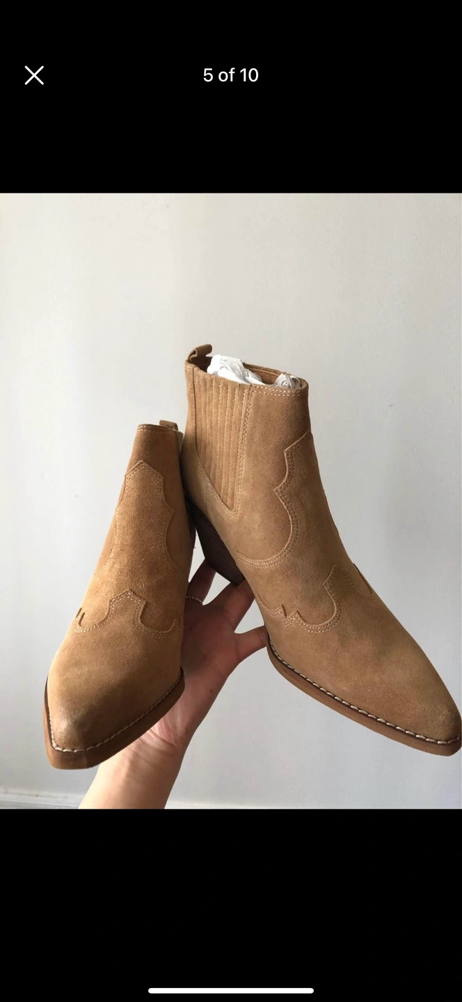 Tan suede booties with a wooden heel.
