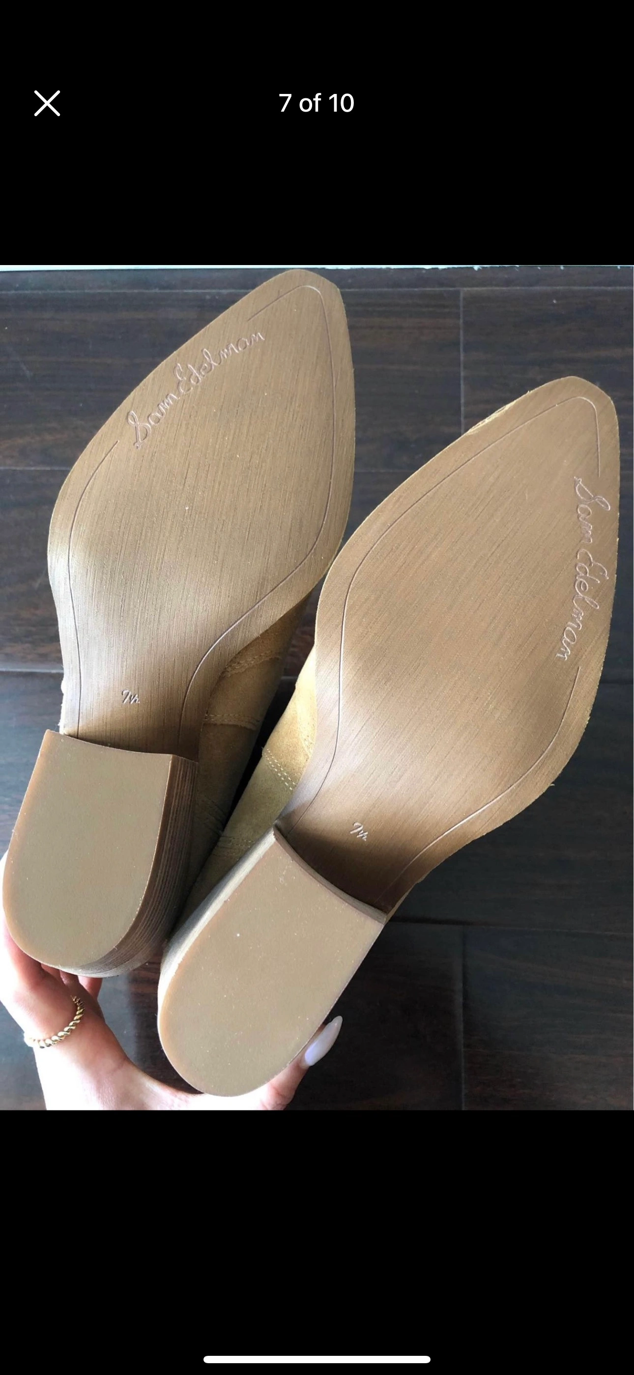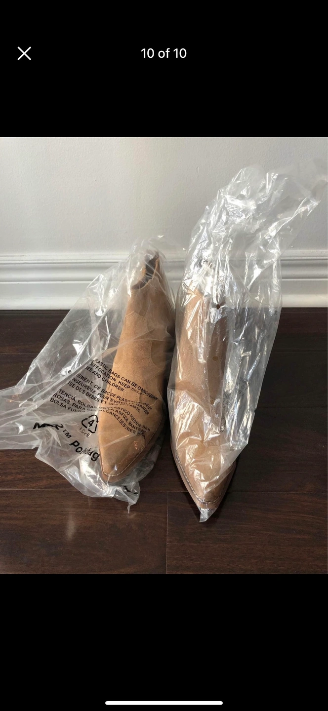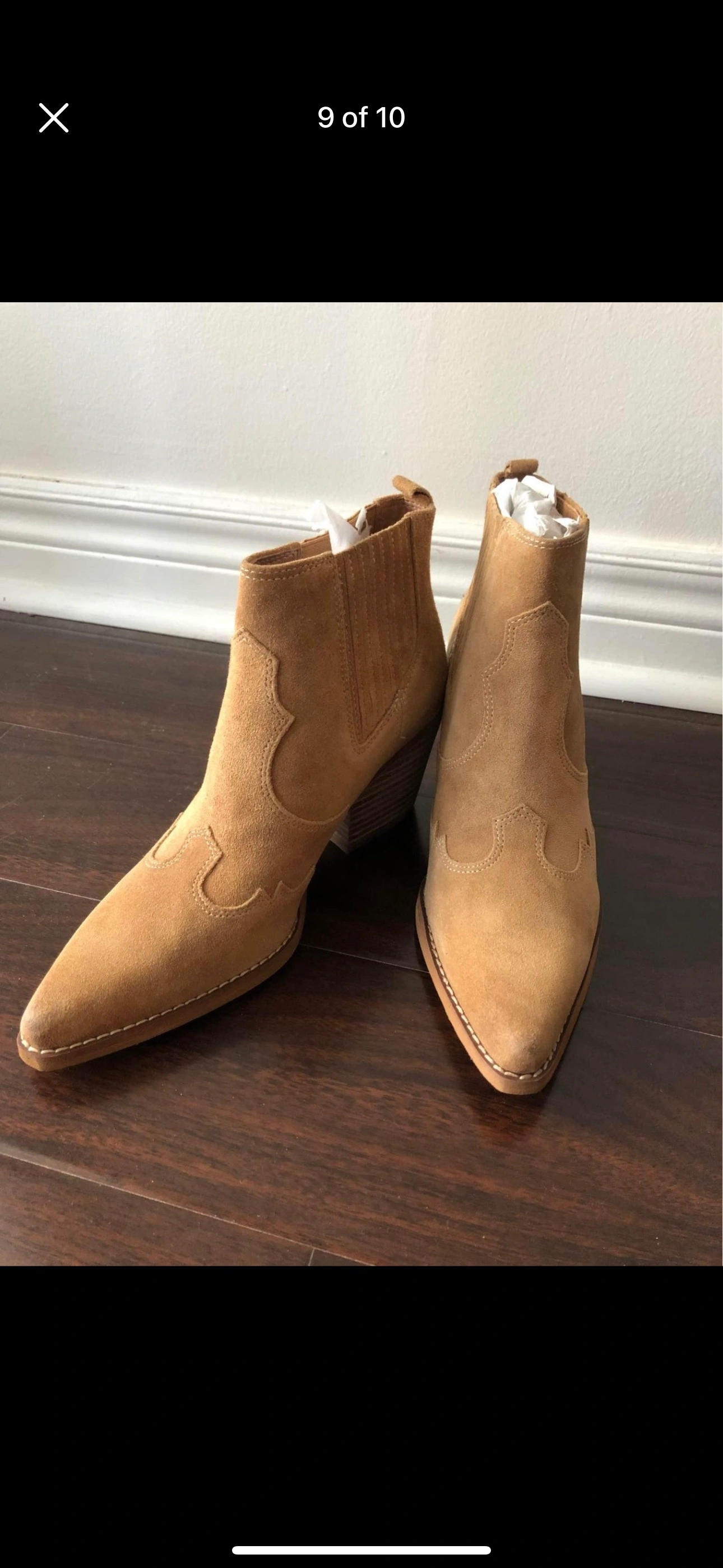 Tan suede booties with a wooden heel.