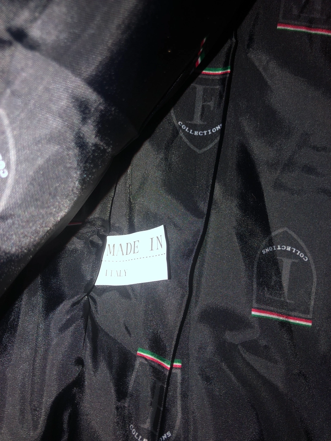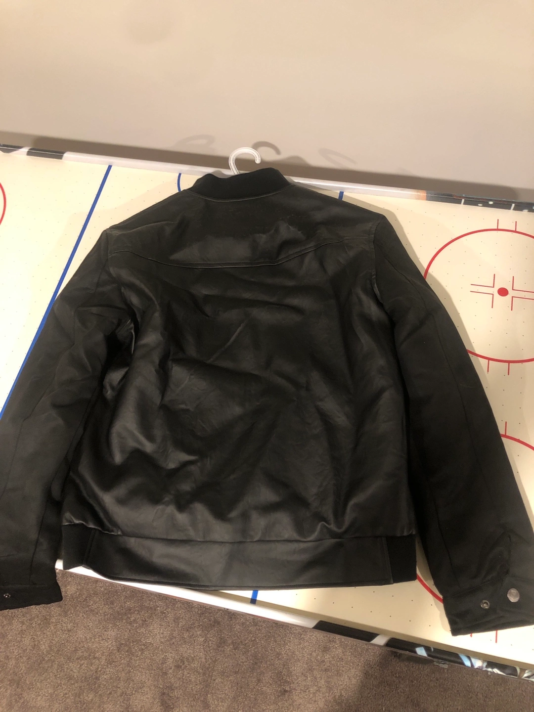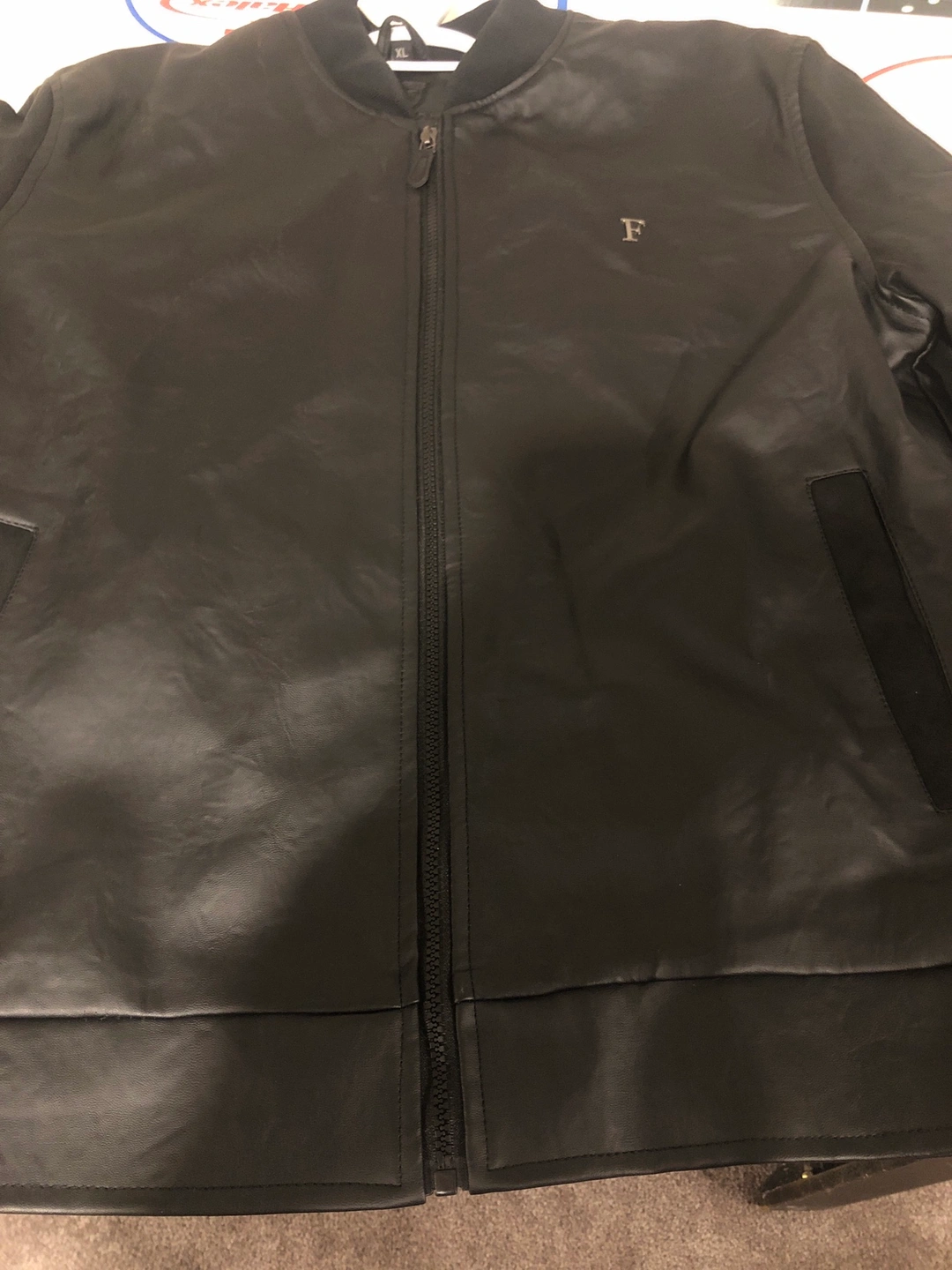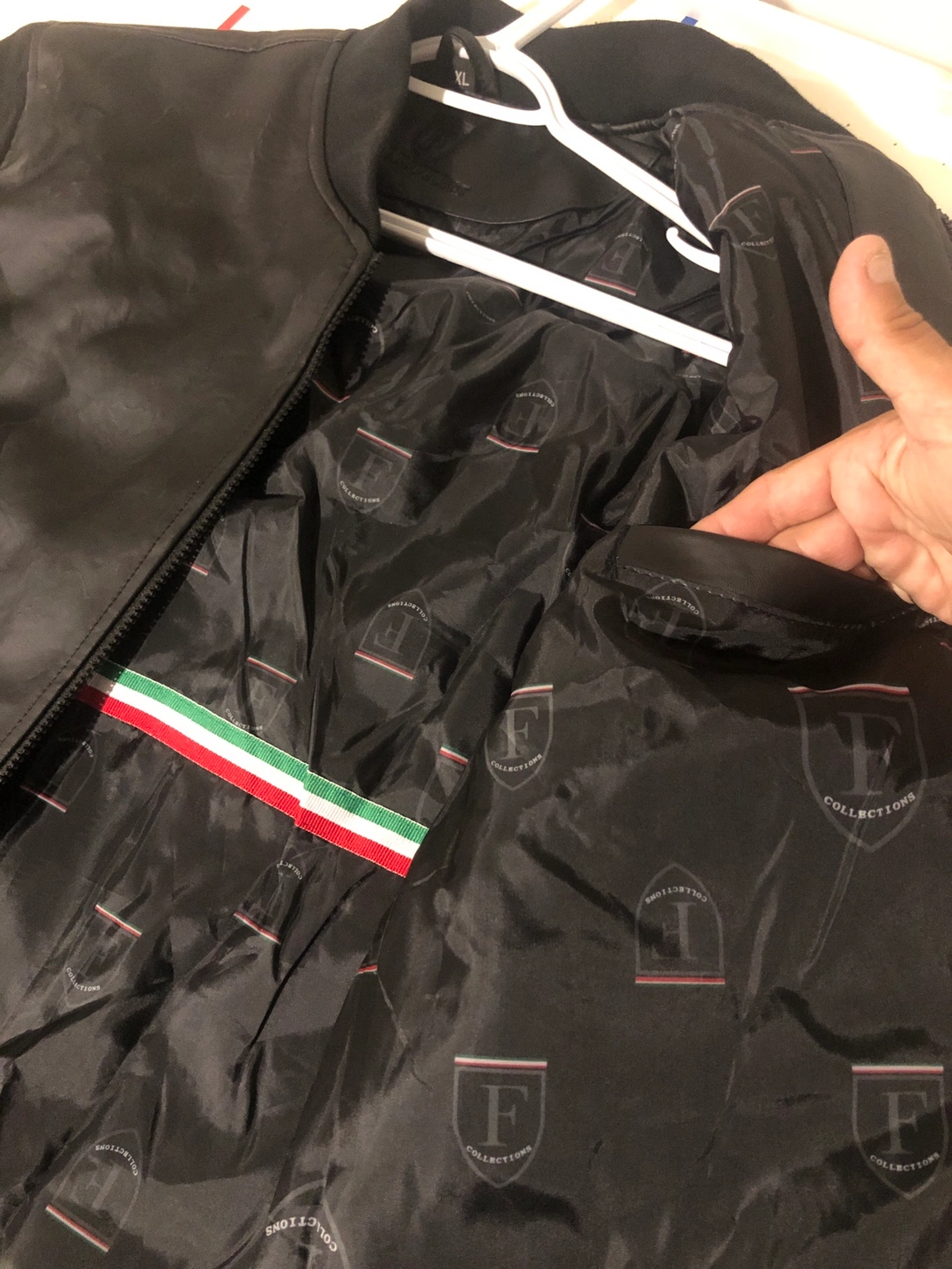 NEW Made in Italy. Black faux leather bomber jacket with suede sleeves & ribbed cuffs and hem. Size XL. It features a zipper closure, two front pockets & an inside pocket.