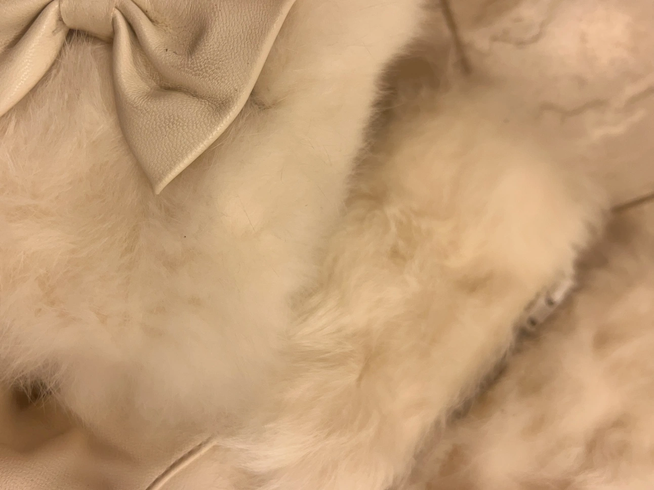 These are cute white ankle boots with faux fur trim and a bow detail on the top. They have a zipper on the side and a high heel. Barely wear it but the bold on one side is missing, you may want to take another off to make them matched.
