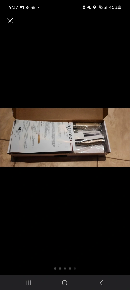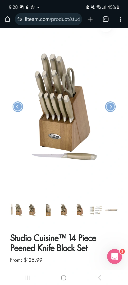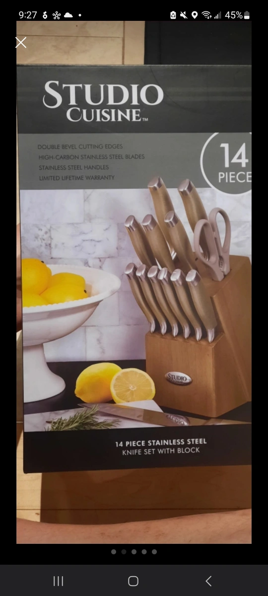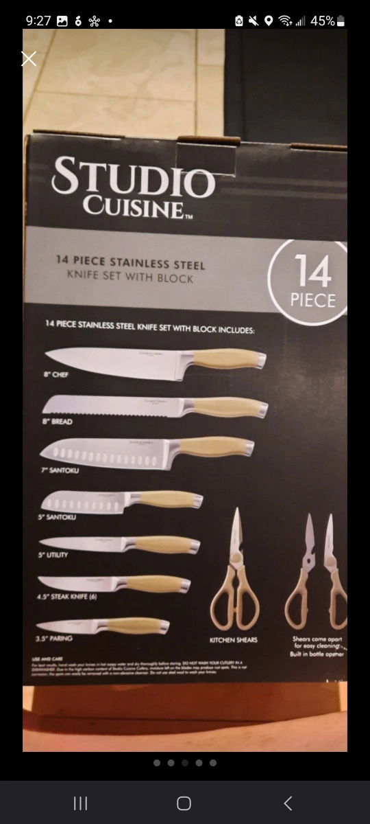 Selling a Brand New Studio Cusine Knife set and block. Golden handles too! Retails for $125+ Double bevel cutting edges High-carbon stainless steel blades Set includes 8” chef’s knife, 8” bread knife, 7” Santoku knife, 5” Santoku knife, 5” utility knife, (6) 4.5” steak knives, 3.5” paring knife, kitchen shears, and wooden knife block. Stainless steel handles with textured finish Hand wash recommended https://www.liteam.com/product/studio-cuisine-14-piece-peened-knife-block-set/