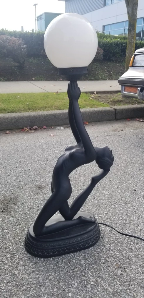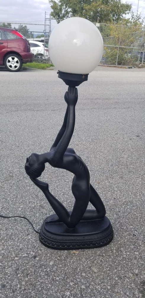 Black table lamp featuring a woman holding up a globe-shaped lamp shade. The lamp is on a black pedestal with a decorative pattern. The lamp cord is included. stands 29 inches tall . cash payment preferred . thanks for looking .