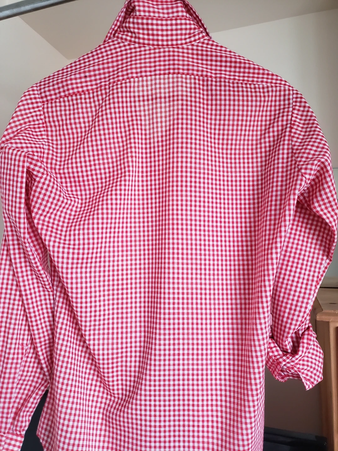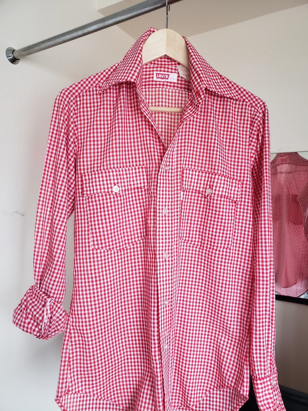 Slim cut size Small Men's shirt, 35% cotton 65% polyester (very lightweight). Classic 70's style and details :)