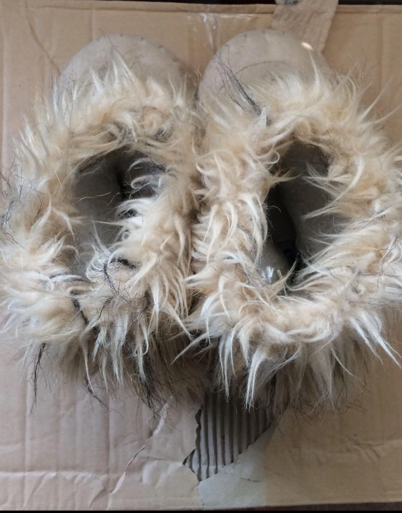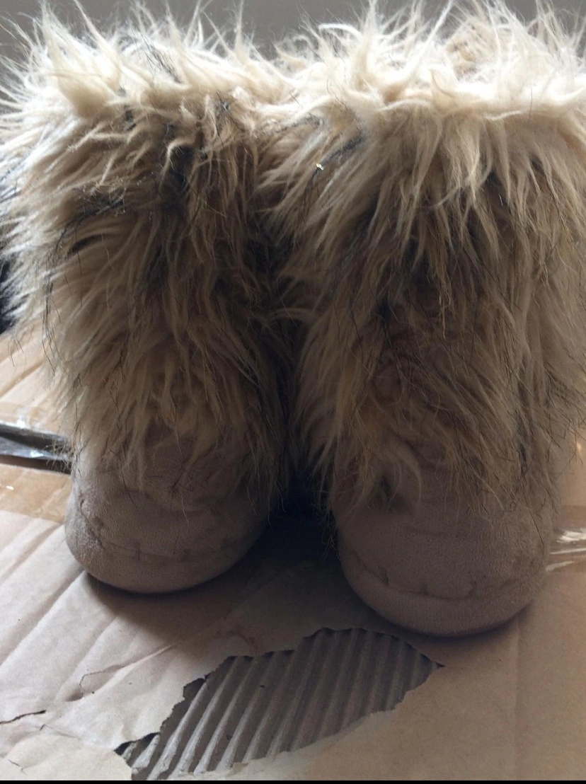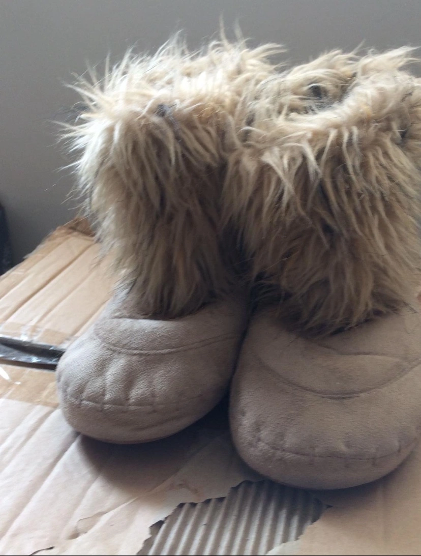 These are a pair of soft and comfortable slipper furry booties. They have a suede look to them and are perfect for keeping your feet warm inside in the winter. They are in good condition and ready to keep your feet warm! OBO