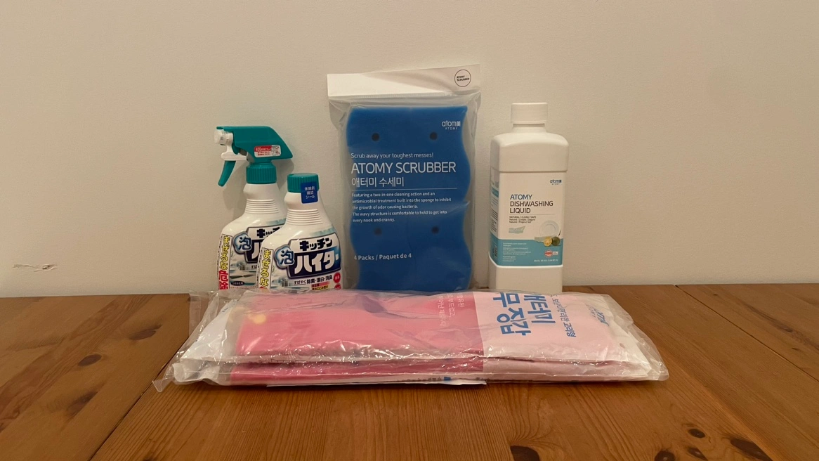 This is a package of cleaning supplies. The package includes two bottles of dish chlorine bleach, one bottle of 1L dishwashing liquid, one scrubby sponge, and two pairs of dishwashing gloves.