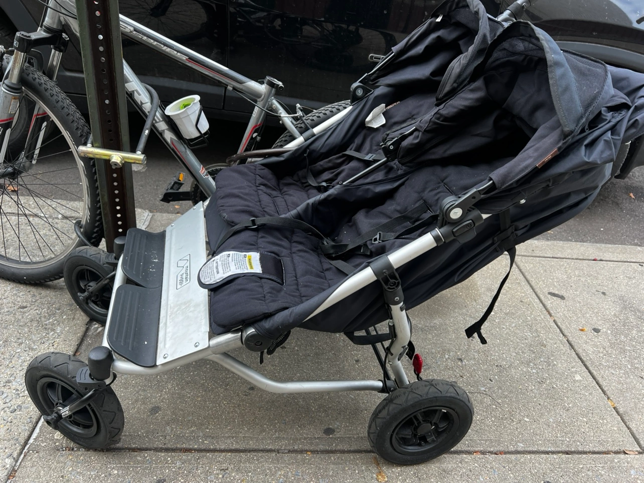 Black double stroller. Has some wear and tear but is in good working condition. The stroller is very sturdy and easy to maneuver.