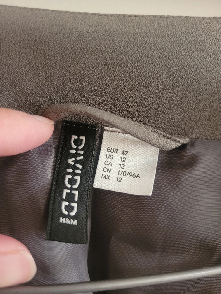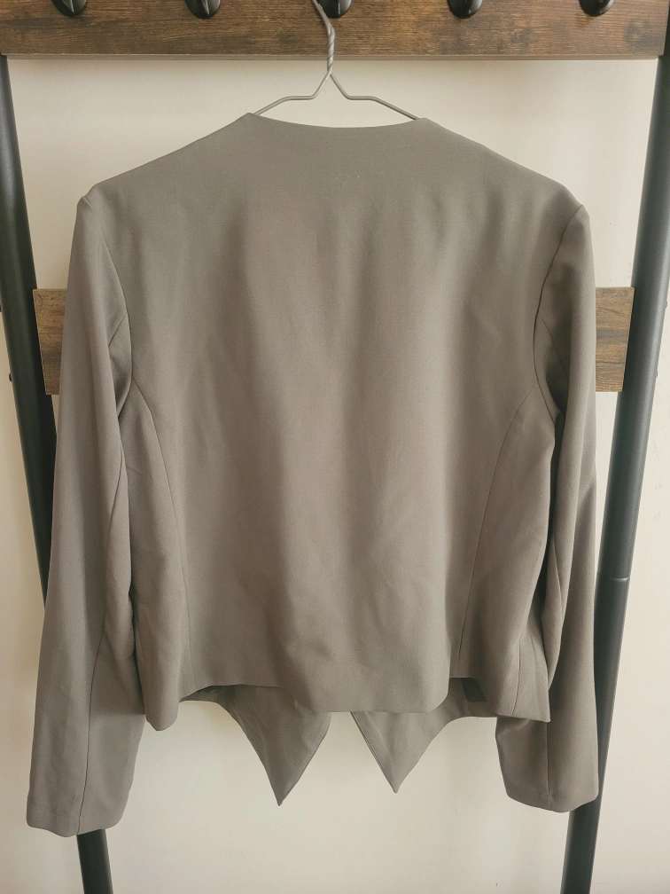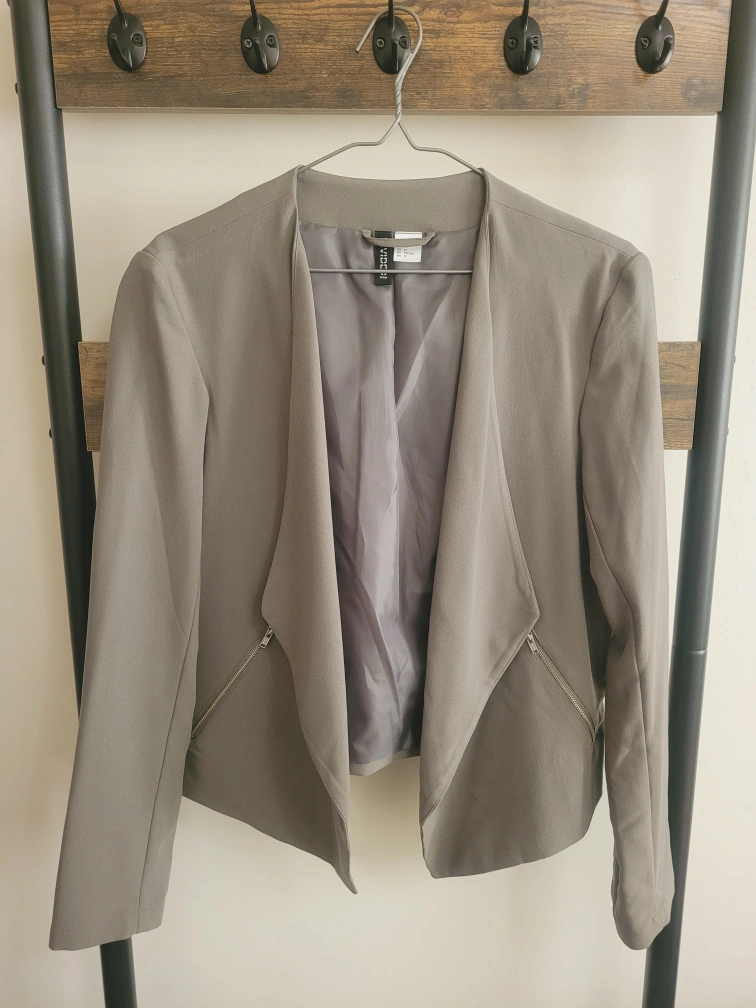 192Greyish Green H&M Divided blazer with zipper detailing. Size 12. It has long sleeves and is cropped. It is a lightweight fabric that is perfect for a casual or dressy look. Never wore.