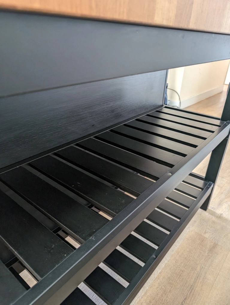 This kitchen island is a great addition to any home. two shelves, and a black finish. It is perfect for preparing food, serving meals, or simply adding extra counter space to your kitchen.