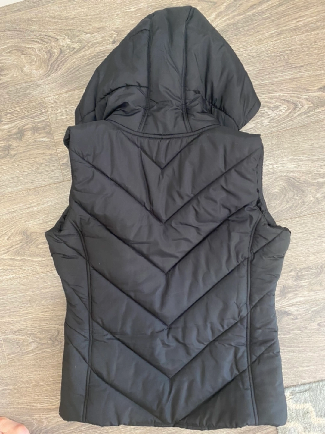 A black Adidas puffer vest with a pink interior and pink accents. The vest has a zipper closure and two zippered pockets. It features a hood with a drawstring.
