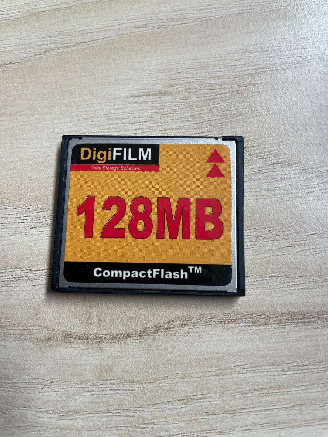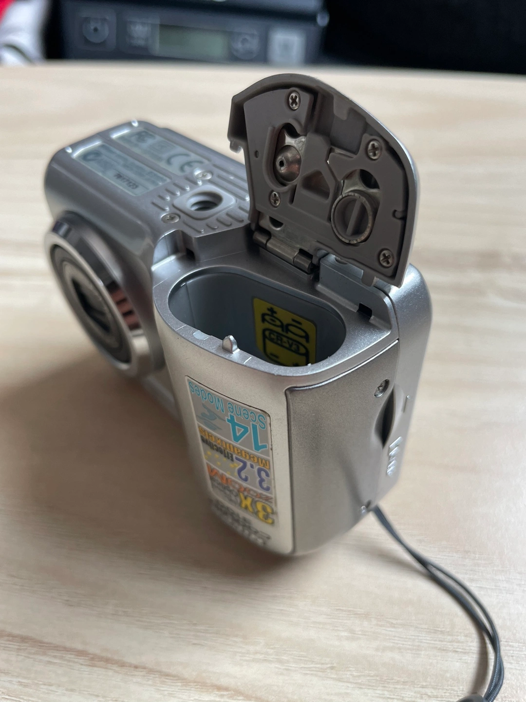Includes camera, memory card, and case. The camera features a 3x optical zoom lens and a 1.8-inch LCD screen. It has a 3.2 megapixel resolution and can take photos and videos. The case is designed to fit the camera perfectly. The camera is compatible with CompactFlash cards up to 1 GB in size. The case is included, as well as a memory card. The battery door, however, does not lock properly. It needs to be held shut for the camera to be powered on. It takes 2 AA batteries.