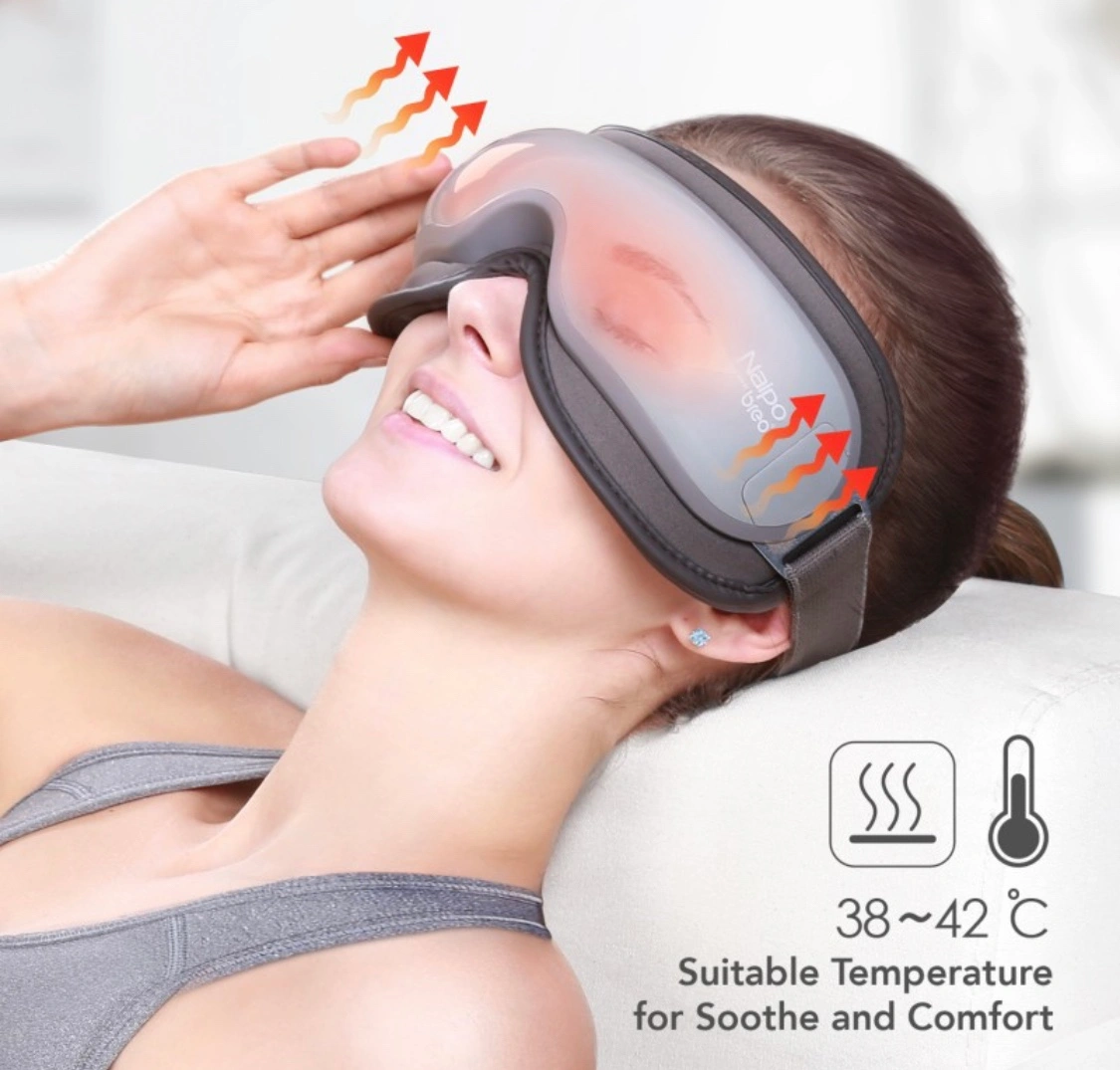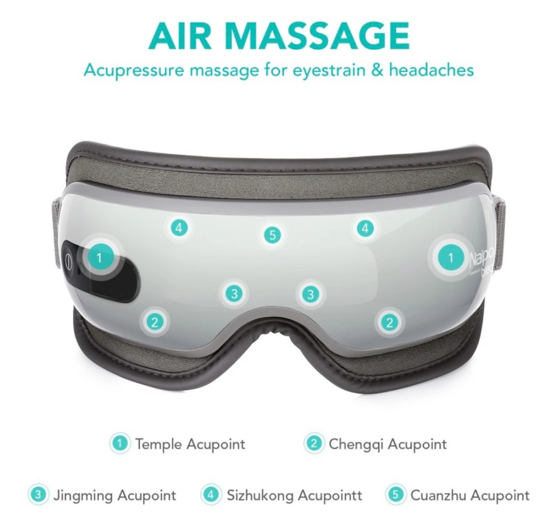 279- The eye massager helps to relax eyes through three modes - Sleep, Medium and Hard. “Sleep” mode provides a gentle massage, “Medium” mode a consoling one, and “Hard” an invigorating one. All modes go with heat. - Air compression and vibration - Rechargeable lithium battery and USB charging provide maximum portability. The tightness of the strap is adjustable.
