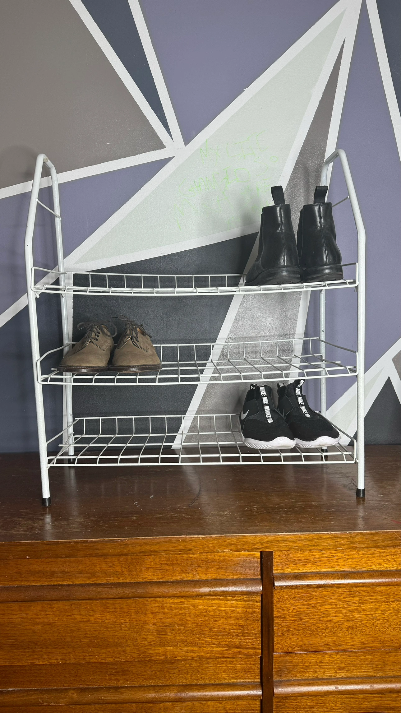 High top shoes at the top. Standard shoes fit middle and bottom tier. Holds a total of 9 shoes. Pending on how you place them, could potentially hold more.