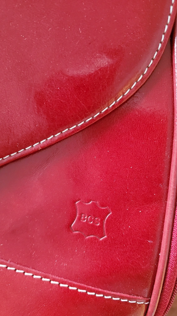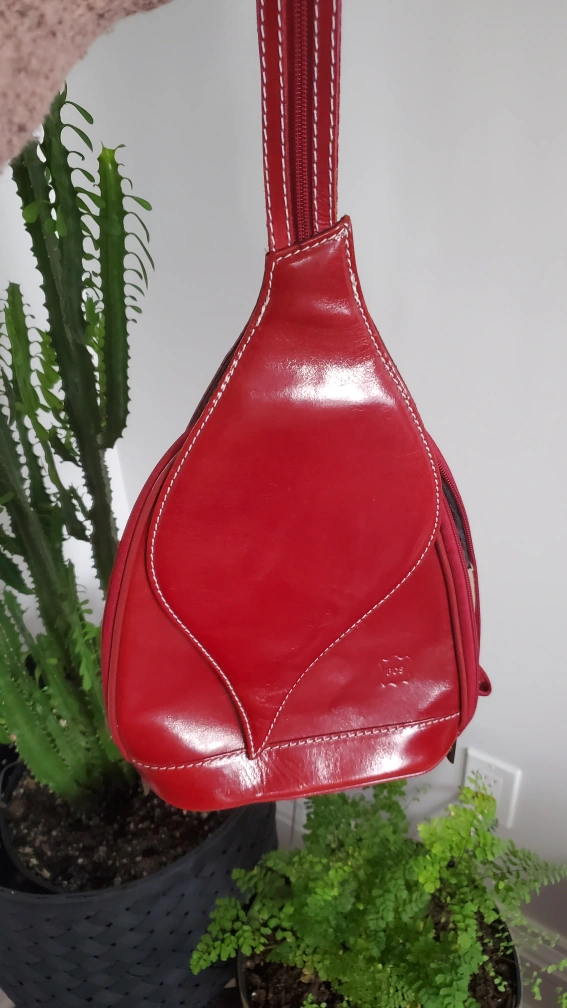 in the style of Italian Vera Pelle. This bag features a red leather exterior with a silver chain strap. It has a zipper closure and a flap closure with a magnetic button. It also has a back zippered pocket. the straps have a zipper down them as well. The bag is in good never used condition. unisex. candy apple red.