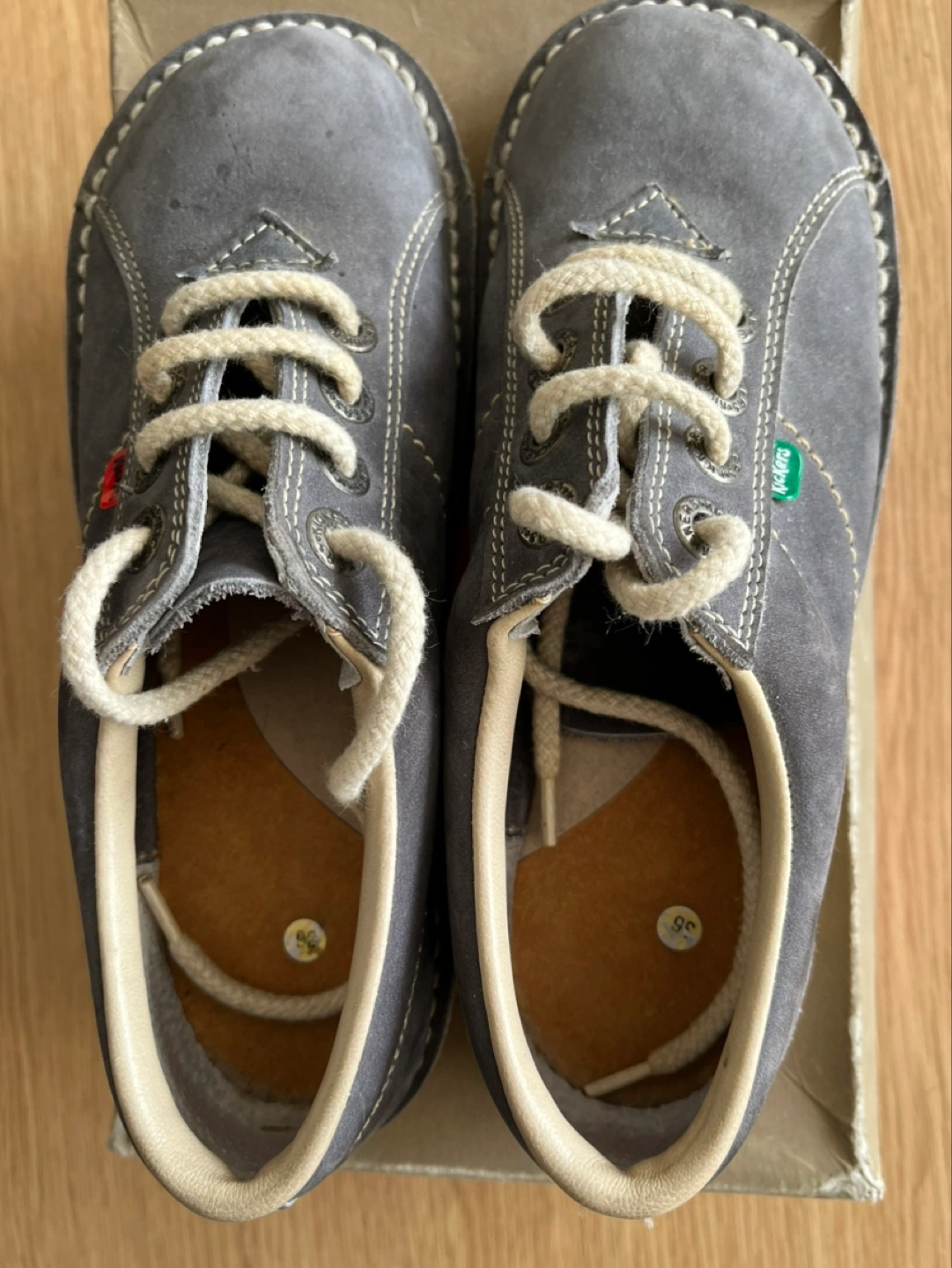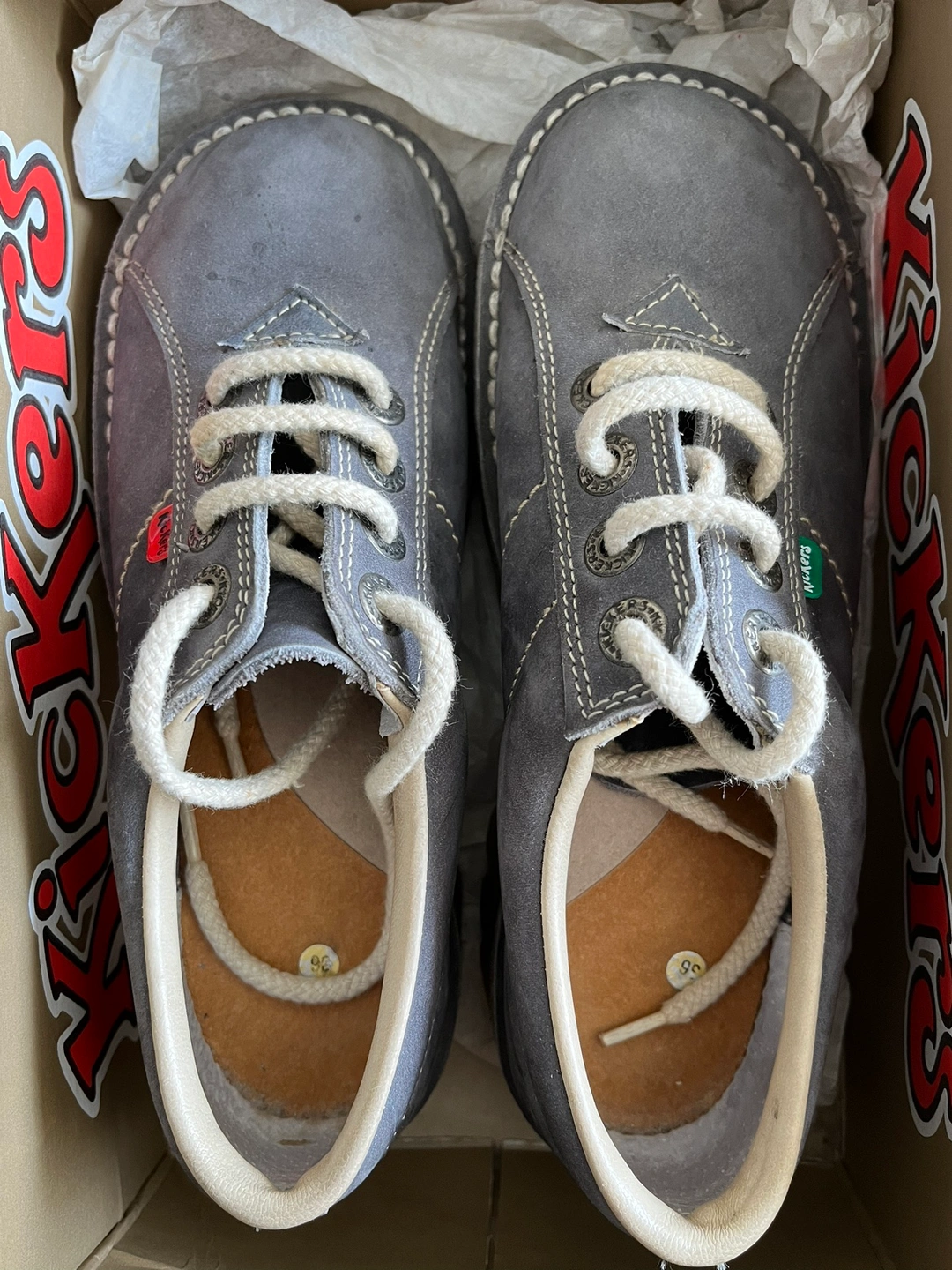 Blue suede leather Kickers shoes with white laces. Size 36 (EU). Made in France. Like new. If ad is up, the shoes are available.