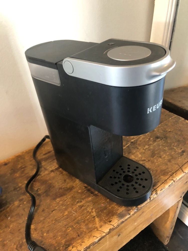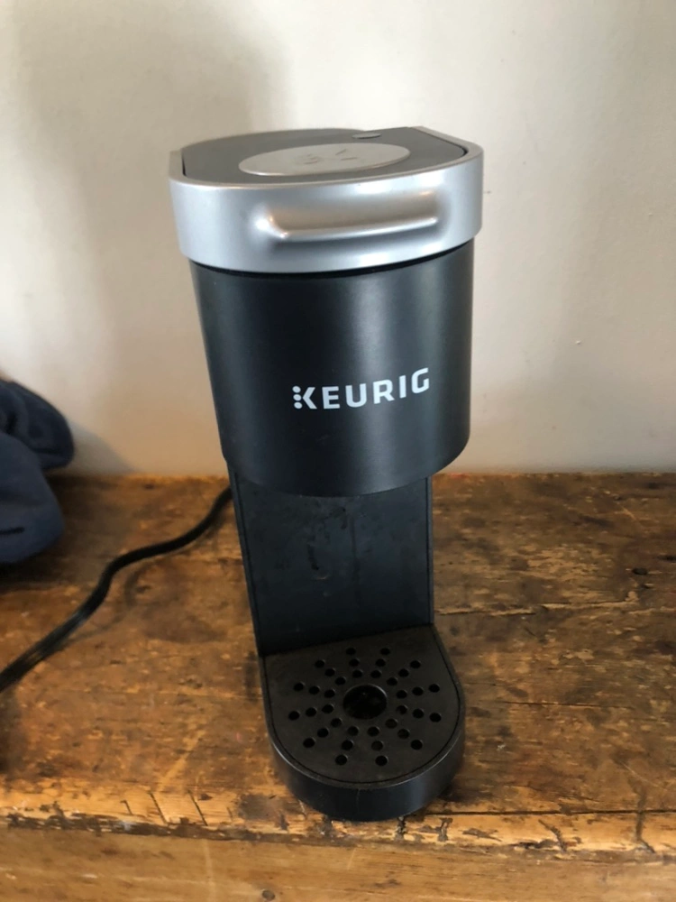 Small, single serve coffee maker. Perfect for a small household. Makes up to 10 oz cups.