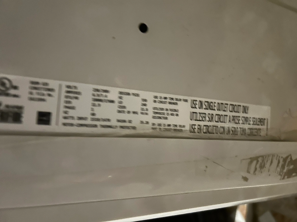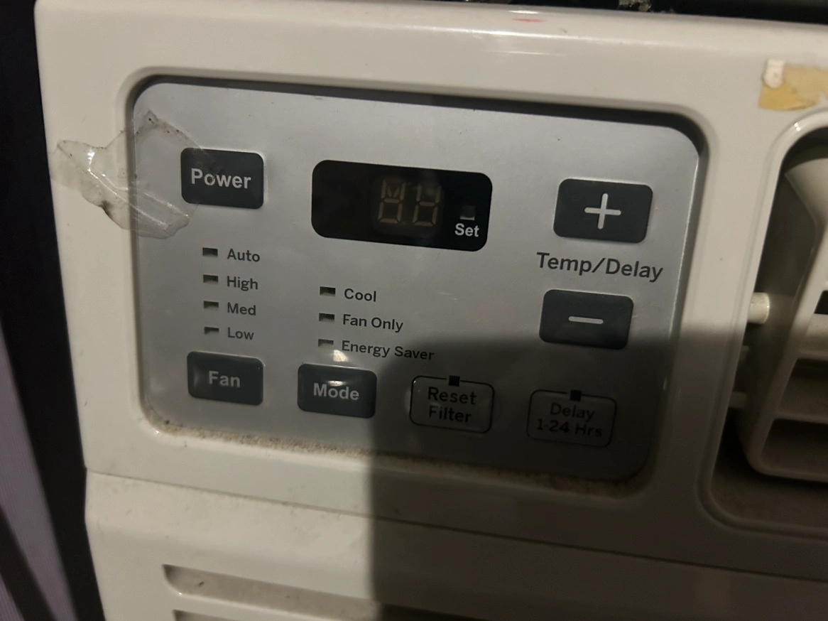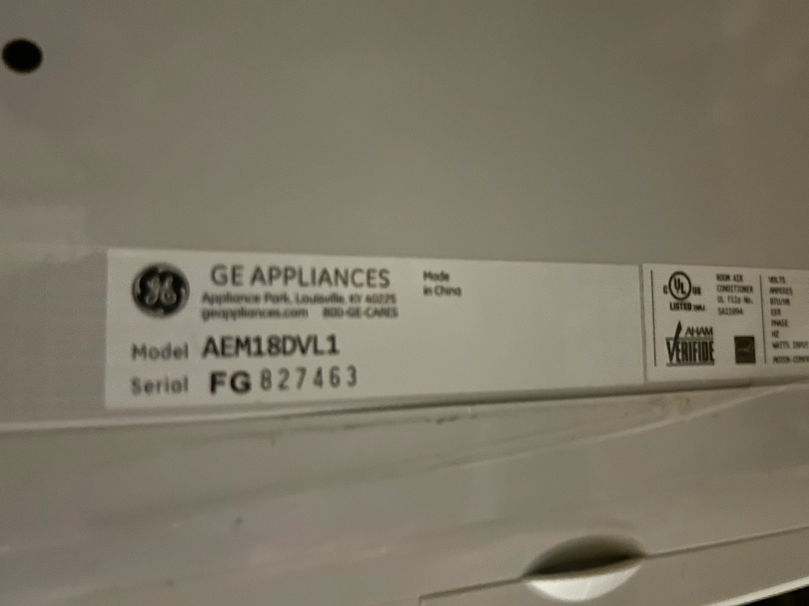 This is a GE Window Air Conditioner. The model number is AEM18DV11. The serial number is FG 827463. The air conditioner has a digital display and a variety of settings, including auto, high, med, low, cool, fan only, and energy saver. It also has a fan speed setting, a mode setting, a reset filter button, and a delay setting. The air conditioner has a power cord with a standard three-prong plug.