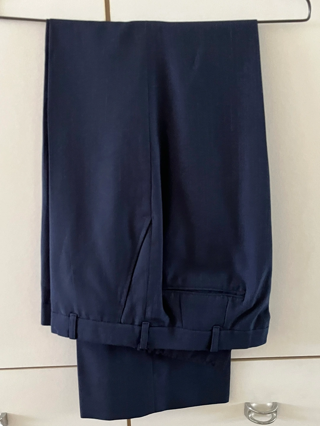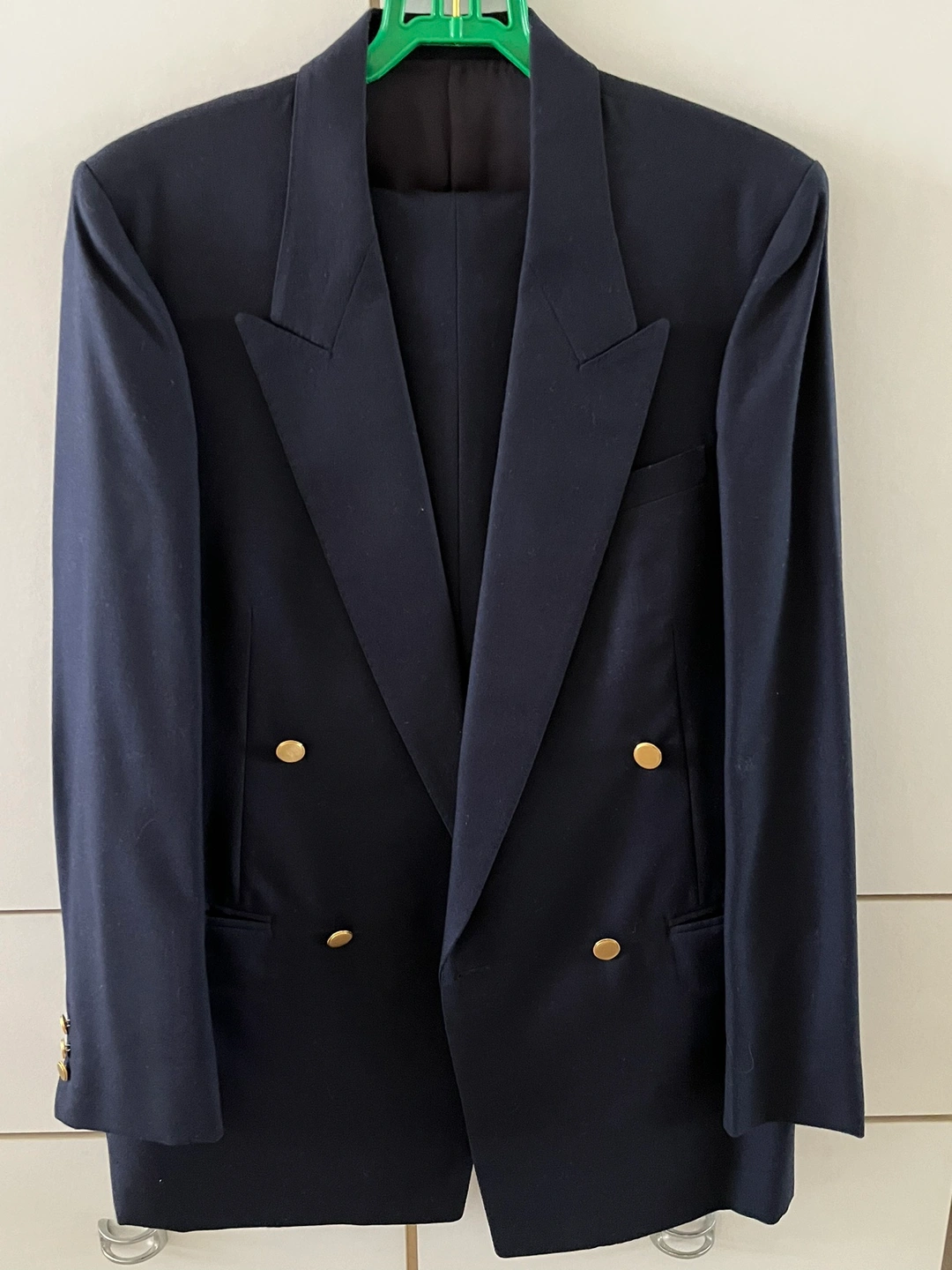 This is a men's suit jacket and pants in a dark navy blue. It has a double-breasted jacket with gold buttons. The suit is made of exclusive English cloth (Rikmar). Size L. More detailed measurements available on request.