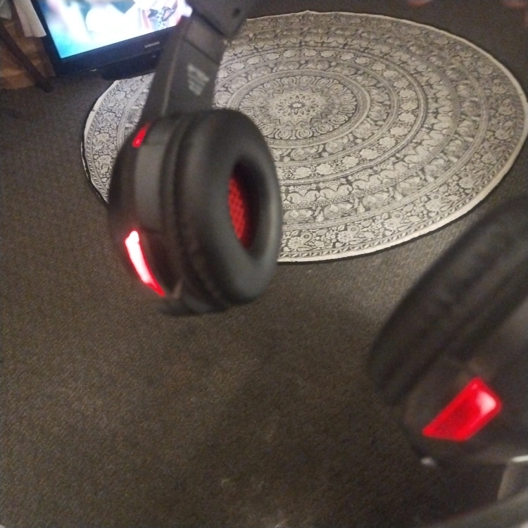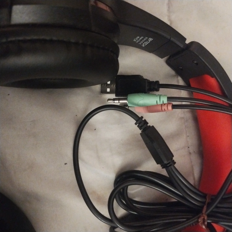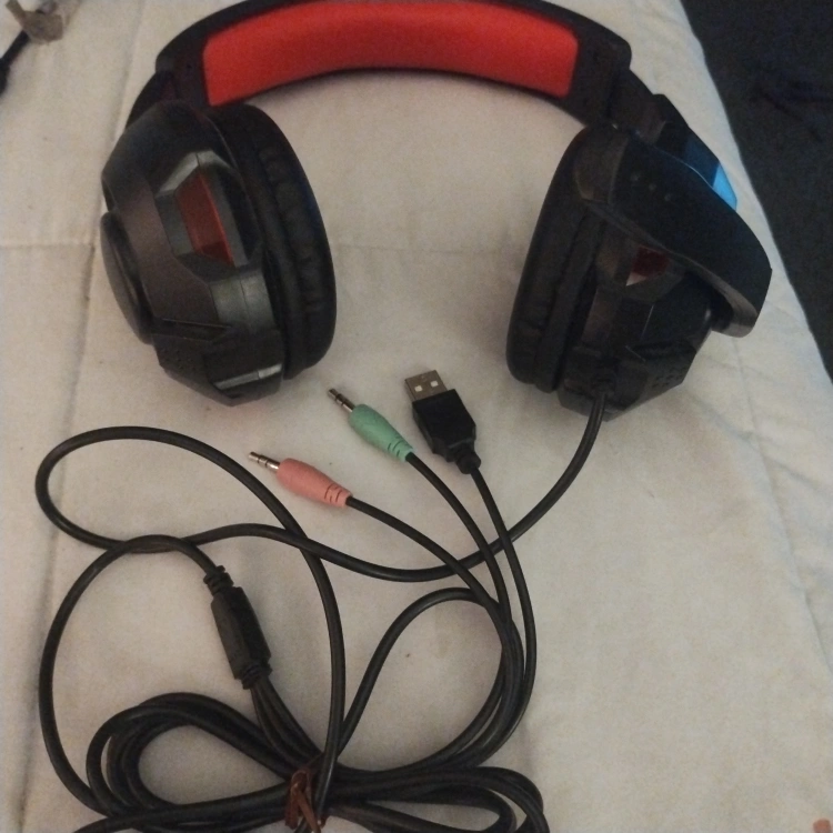 123Black wired gaming headphones with a red accent. They have a USB, microphone and audio jack.