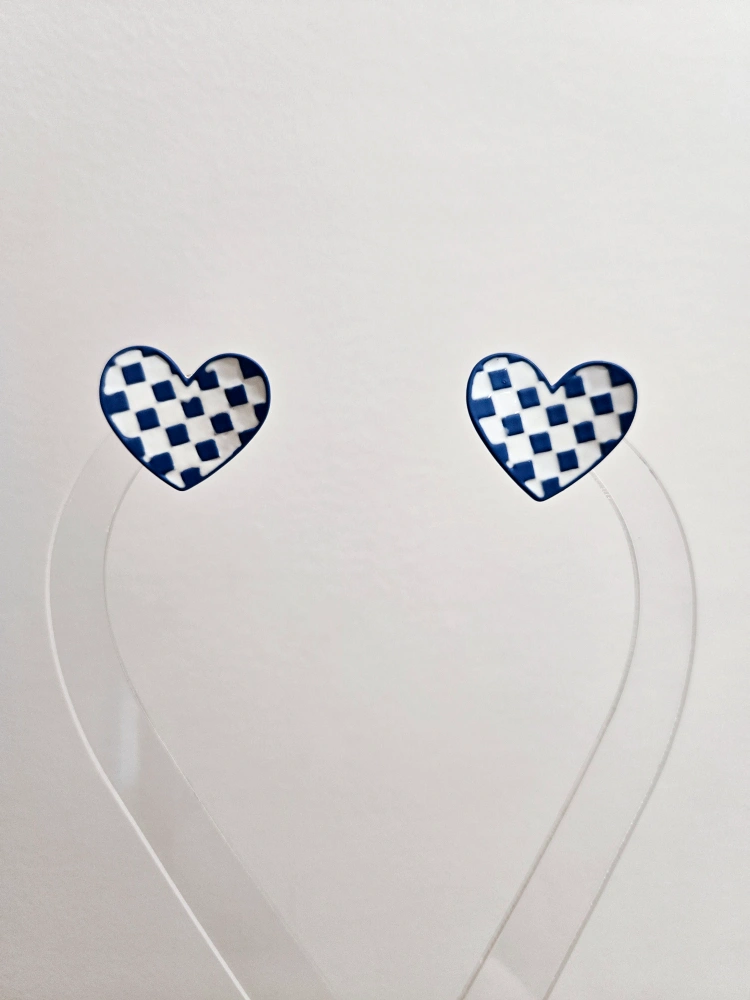 Korea Ceramic Blue and White Checkered Heart Earrings